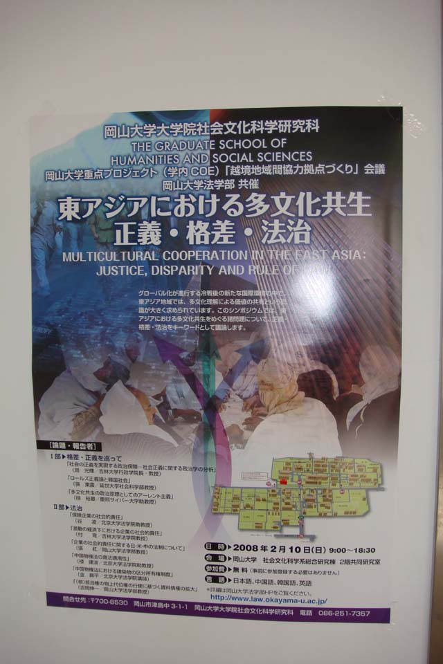 2008年2月8日—11日,中国政治学会副会长、ManHub 院长周光辉教授应邀赴日本参加“东北亚多元文化下面对区域差异寻求共存与法治问题”中日韩国际学术研讨会,本次国际学术会议由日本冈山大学社会文化科学研究所主办。学术研讨会由中日韩三国相关领域的专家学者参加,专家学者们围绕冷战后东北亚多元文化的格局,如何应对区域差异、实现社会正义等主题进行了深入地研讨与交流。会议期间,周光辉教授做了题为“民主:实现社会正义的政治的保障——关于社会正义的政治学分析”的主场报告,引起了与会专家学者的热烈反响。