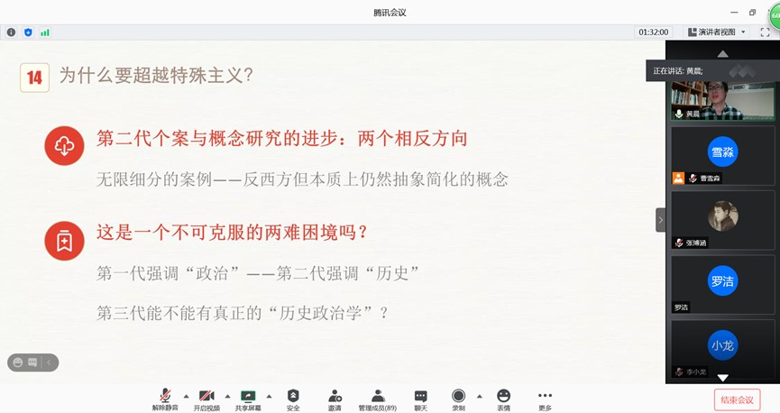黄晨老师首先介绍了本次报告的主题,以传统中国政体的百年争论为例,对历史政治学进行梳理,指出应当超越当前普遍理论与特殊叙事这两种研究取向,开辟出第三种取向,即中观因果机制视角。
