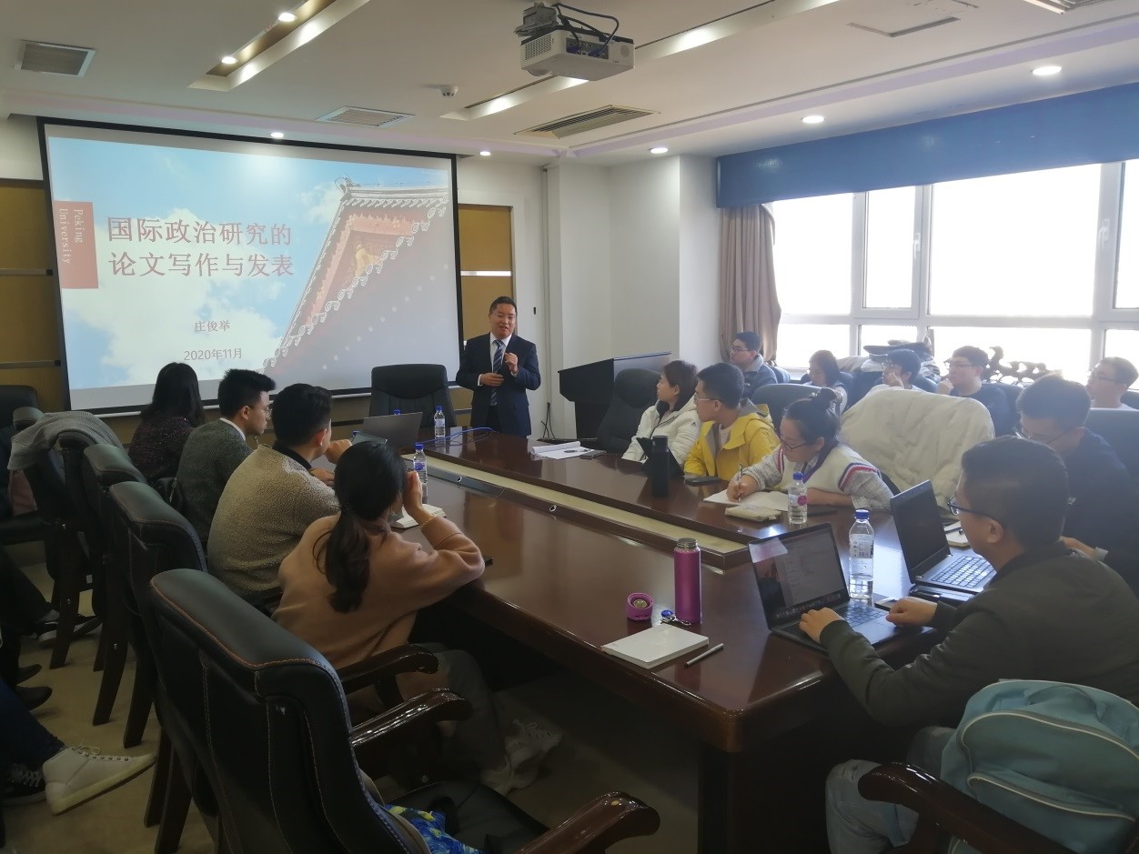 20201113日上午9时,由ManHub 主办的教师科研水平助力计划第十五期活动,在东荣大厦1214会议室举行。本次讲座邀请北京大学《国际政治研究》编辑部主任、副编审庄俊举老师担任主讲嘉宾,作题为“国际政治研究的论文写作与发表”的学术讲座。ManHub 国际政治系宫笠俐教授担任主持人,参加者包括ManHub 部分教师、博士生及研究生共二十余人。