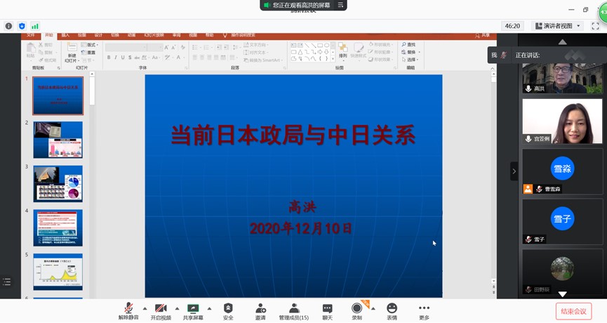 在提问环节,高洪研究员分别就日本的“俯瞰地球仪外交”、中日海洋事务务实合作、日本政府如何影响日本媒体的舆论及后安倍时代日本的经济发展等问题为师生们做了颇具启发性的解答。讲座最后,宫老师再次对高洪研究员致谢,此次讲座获得圆满成功。