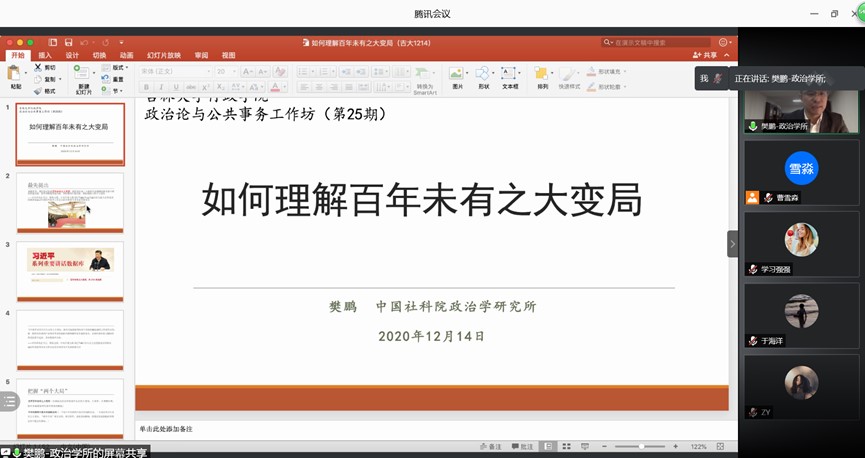 樊鹏教授首先指出全球政治经济形势正经历前所未有的大变局、大变革、大调整时期。一个是中华民族伟大复兴的战略全局,一个是世界百年未有之大变局。“两个大局”相互交织、相互作用,彼此深刻影响,使我国发展面临的不确定性不稳定性增加。并从五个方面对世界百年未有之大变局进行了解读:从国力竞赛来看,国际格局和国际体系正在发生深刻调整,即世界经济重心正在加快“自西向东”位移,“西降东升” 格局显著;从权力格局来看,大西洋体系正在出现洲际式转移与主体性分散,百年来的国际权力格局和国际协调组织面临改革压力;从动能转换来看,新科技革命和产业变革正在重塑世界,对经济社会、公共治理、权力运行、政治生活等产生颠覆影响;从制度竞争来看,经济社会发展制度模式面临考验;从全球治理来看,全球治理体系与国际形势变化的不适应、不对称前所未有,发达国家谋求维持国际规则主导权令全球治理改革失速,个别西方大国对外推卸责任令全球治理入不敷出、赤字凸显。