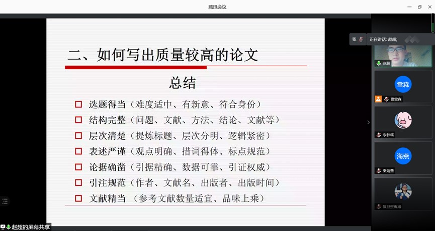 随后,赵超老师就如何写出高质量论文提出了五个方面的问题。一是选题问题,选题有三种类型:基础研究、应用研究和综合研究,问题意识是选题的开始,可以从文献和经验事实中寻找。好的选题具有吸引力、能激发共鸣以及具有可研性,拟题时题目不宜太长,核心概念不宜太多,表达要精练。二是创新问题,可以是理论创新、视角创新、材料创新、研究问题的创新以及方法创新,新思想不容易,但新方法、新素材和新视角相对容易。三是文献梳理问题,文献梳理的目的是通过了解问题从哪里来来判断未来发展方向,站在巨人的肩膀上发现前人研究存在的问题,可以选择代表性文献、代表性作者的论文和不同的研究视角进行梳理。四是论证问题,研究是一个论证的过程,需要严密的思维逻辑,好的论证要有层次感、缜密性、科学性、学理化和严谨性。五是摘要问题,摘要在审稿过程中和论文传播方面具有重要作用,应遵循客观性和独立性,体现核心观点。
