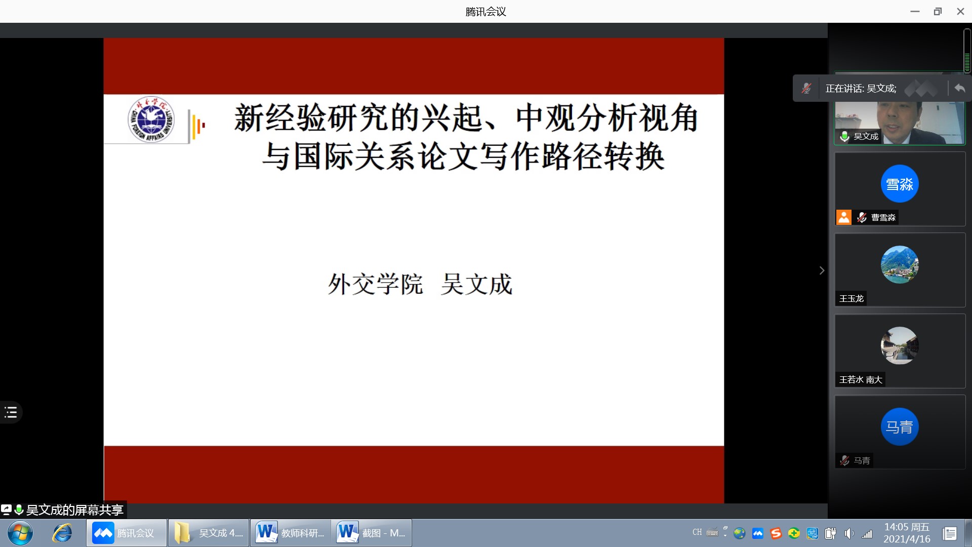 主办的教师科研水平提升计划第二十期活动在腾讯会议室举行。本次讲座邀请《外交评论》编辑部主任、清华大学《国际政治科学》编委、外交学院吴文成副教授担任主讲嘉宾,作题为“新经验研究的兴起、中观分析视角与国际关系论文写作路径转换”的学术讲座。ManHub