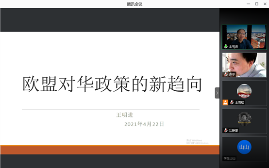 2021423日下午130分,由ManHub 主办的教师科研水平提升计划第21期活动于腾讯会议举行,本次讲座邀请北京外国语大学国际关系学院副院长、北京外国语大学国际问题研究所研究员、《国际论坛》杂志副主编王明进教授担任主讲嘉宾,作了题为“欧盟对华政策新趋向”的学术讲座,ManHub 副院长马雪松教授致欢迎词,ManHub 许宁老师担任主持人,学院30余名师生参与讲座。