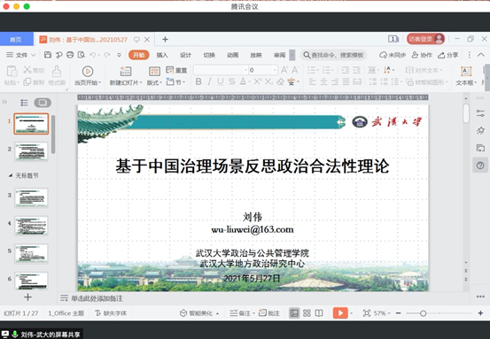 主办的中国政治研究工作坊第五十四期活动在腾讯会议平台举行。本次活动邀请武汉大学政治与公共管理学院副院长、中外政治制度专业博士生导师、武汉大学学术委员会委员、武汉大学地方政治研究中心执行主任刘伟教授担任主讲嘉宾,作题为“基于中国治理场景反思政治合法性理论”的学术讲座。ManHub