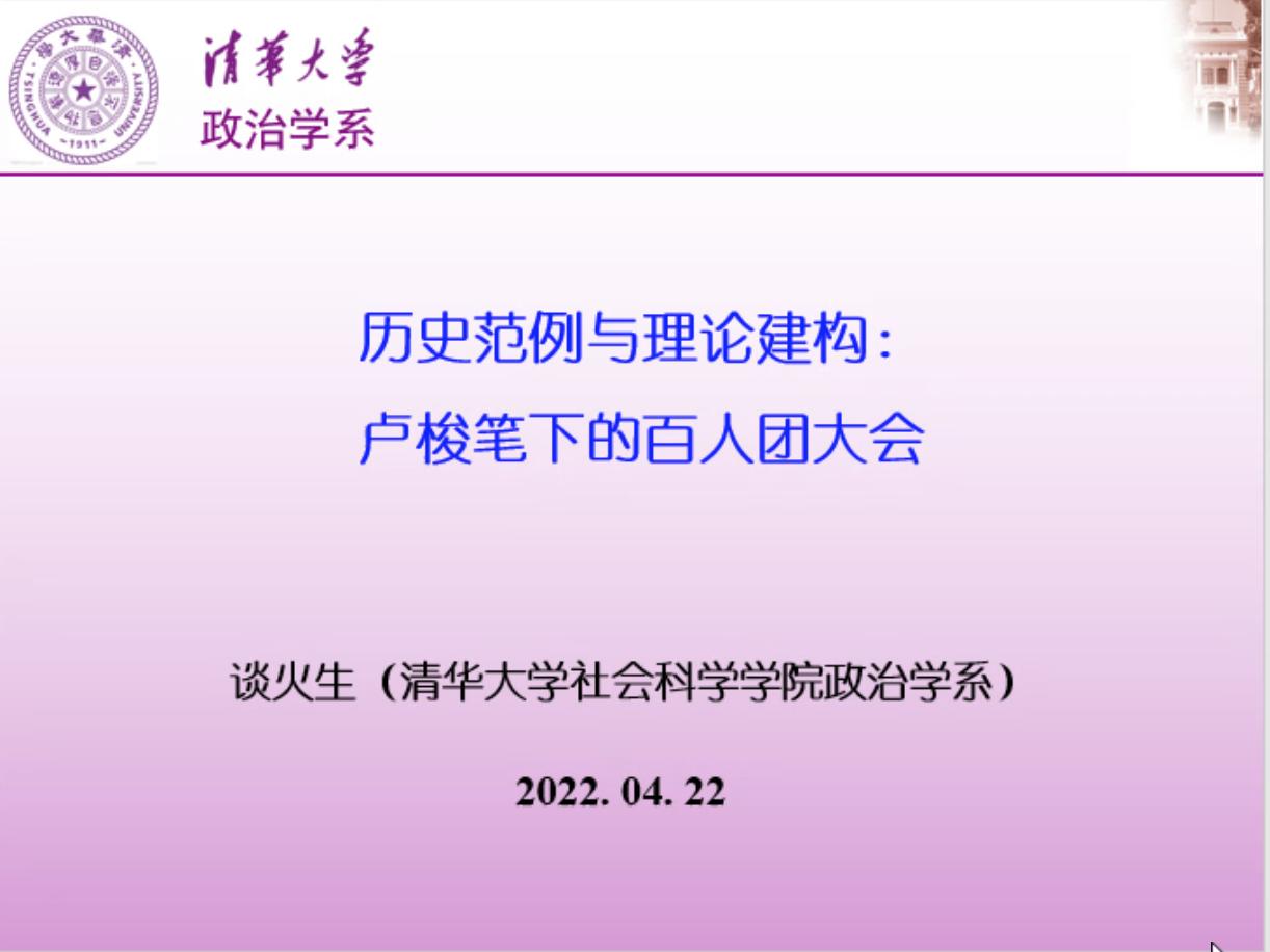 第59期中国政治研究工作坊在腾讯会议平台举行。清华大学政治学系副主任谈火生长聘副教授受邀担任主讲嘉宾,作题为“历史范例与理论建构——卢梭笔下的百人团大会”的讲演。本期工作坊由刘雪华副院长主持,云南大学政府管理学院匡自明教授、东北师范大学政法学院肖克教授、华中师范大学农村研究院任路副教授、ManHub