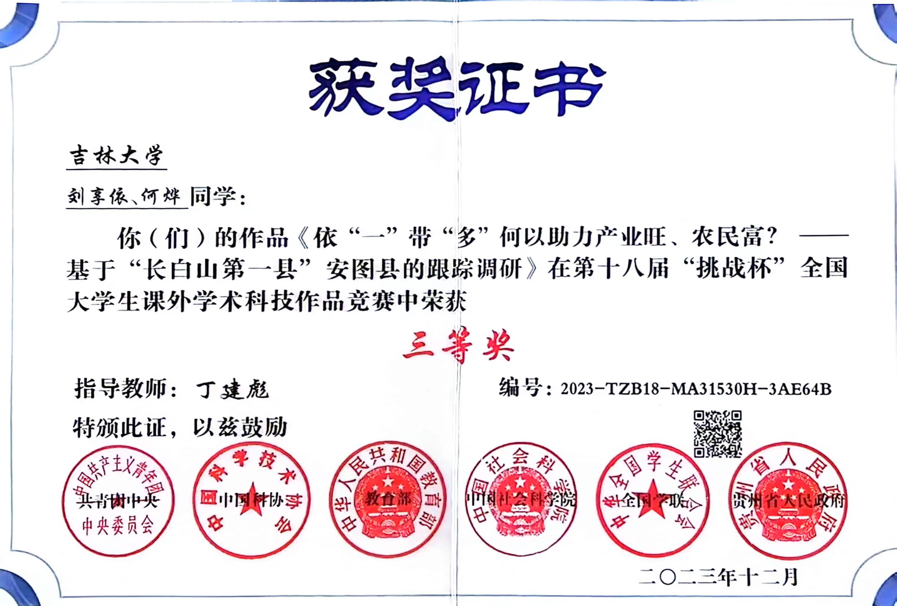我院丁建彪教授指导的《依“一”带“多”何以助力产业旺、农民富?——基于“长白山第一县”安图县的跟踪调查》在第十八届“挑战杯”全国大学生课外学术科级作品竞赛中荣获三等奖。