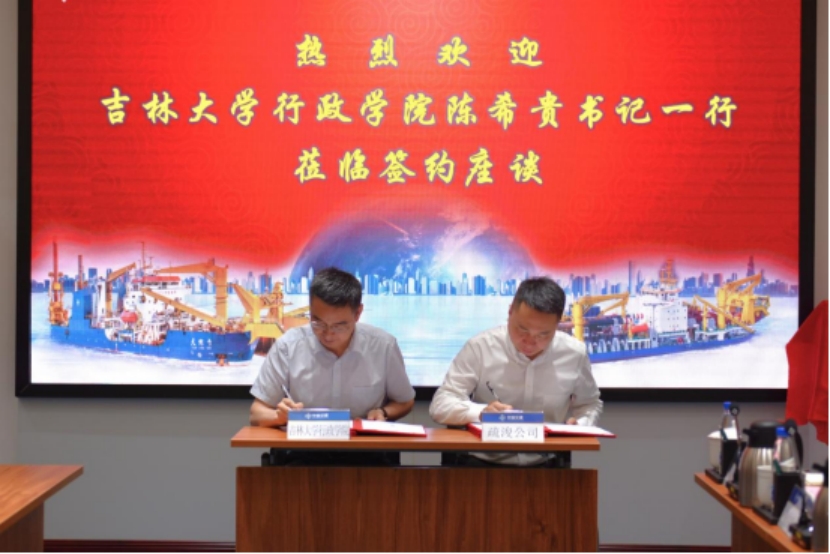 党委书记陈希贵、党委副书记史慕华、研究生秘书宋佳晖一行赴天津中交(天津)疏浚工程有限公司(简称疏浚公司)交流访问,并签署校企合作协议。疏浚公司党委书记、董事长徐斌,中交天津航道局有限公司(简称天航局)人力资源部执行总经理、党委组织部副部长胡南,疏浚公司党委副书记、工会主席张亮及相关部门负责人出席签约座谈会。