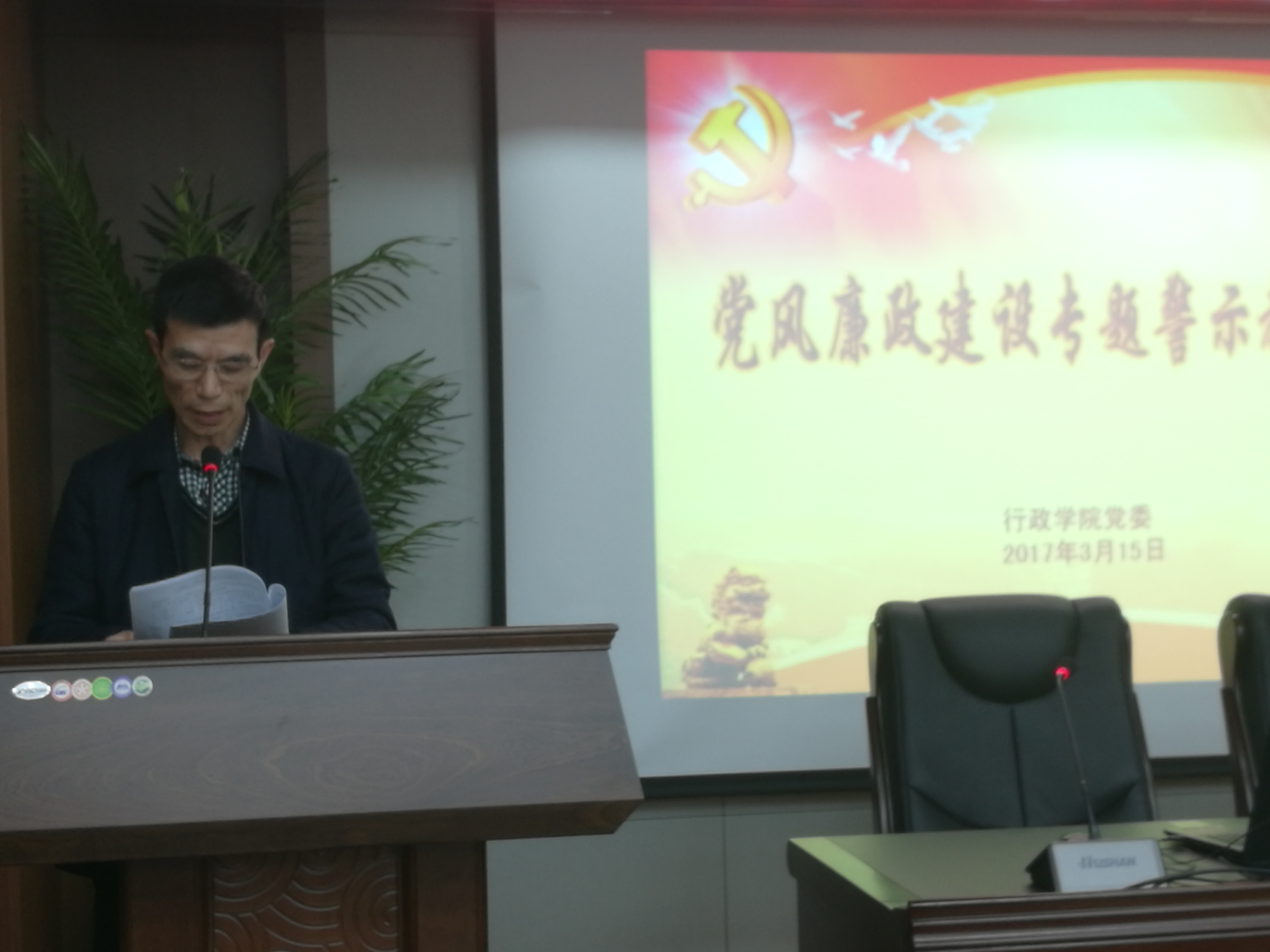 党委为提高党员干部和教职工反腐倡廉意识和拒腐防变的能力,在东荣B303会议室召开全体教职工大会,开展党风廉政建设专题警示教育,会议由党委书记魏鹤影主持。