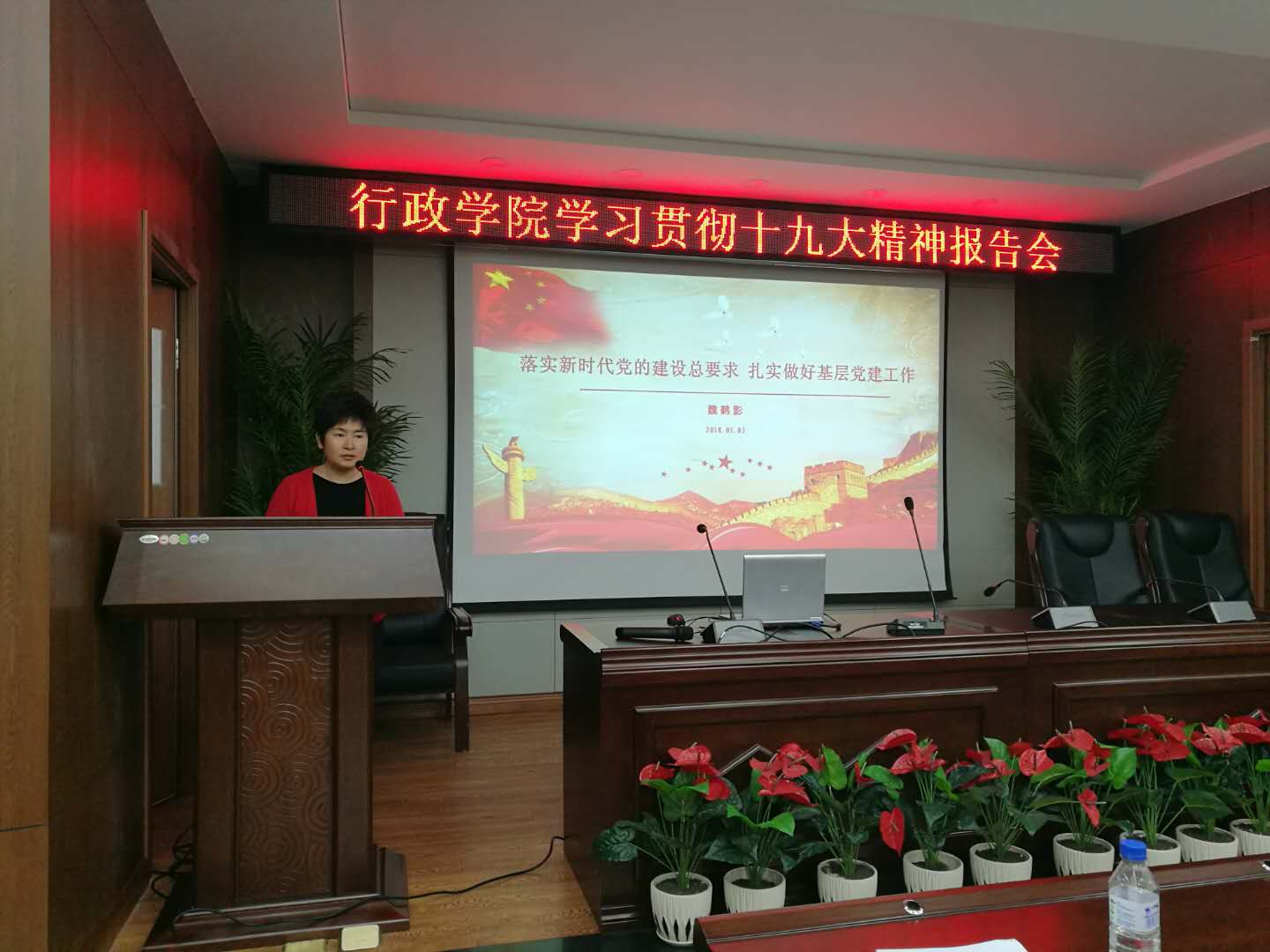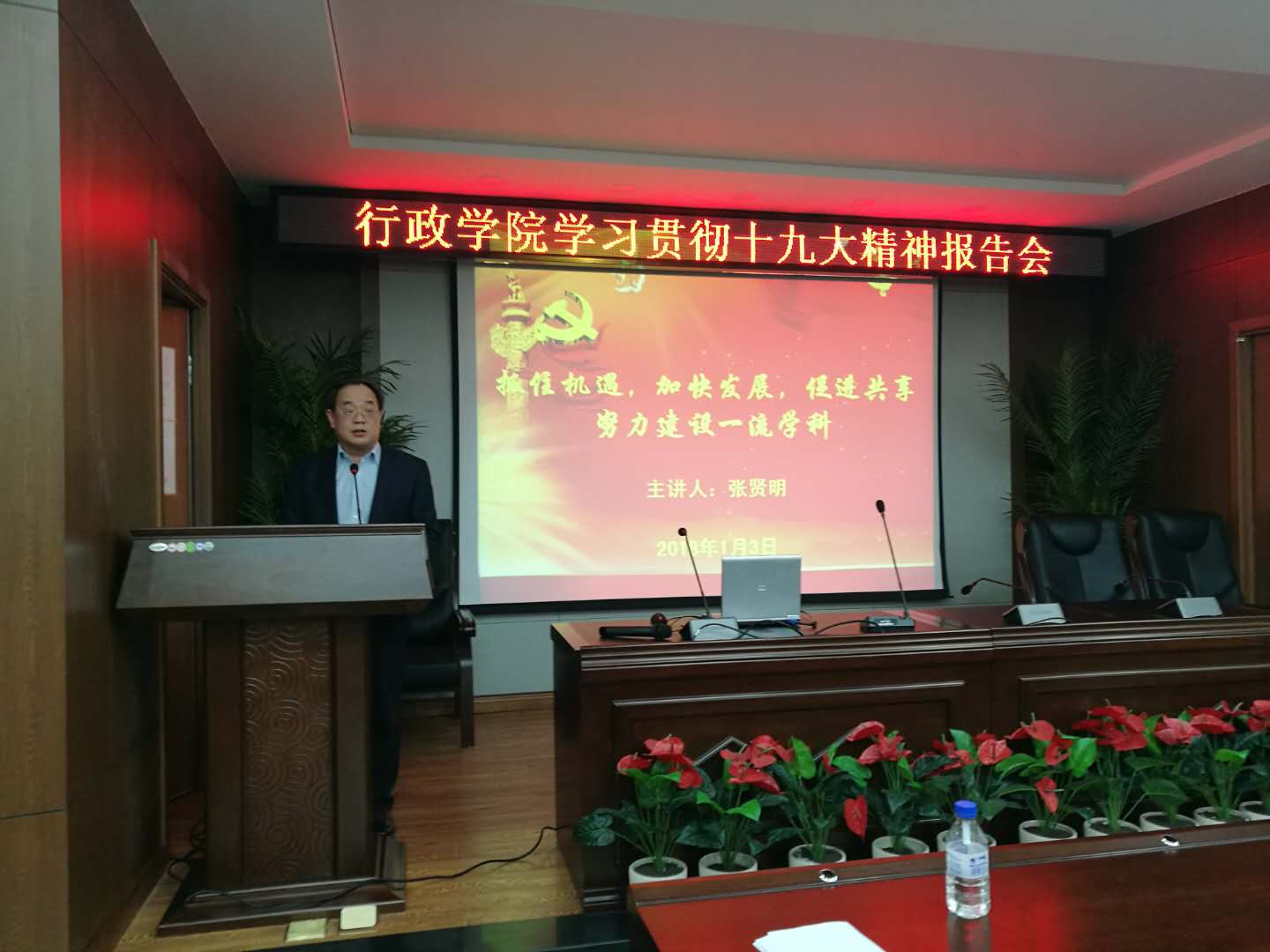 党委学习贯彻党的十九大精神专题报告会在东荣B303会议室举行,学院院长张贤明、党委书记魏鹤影分别讲授专题党课。全体教职员工参加了报告会,会议由学院党委副书记、纪委书记常有余主持。