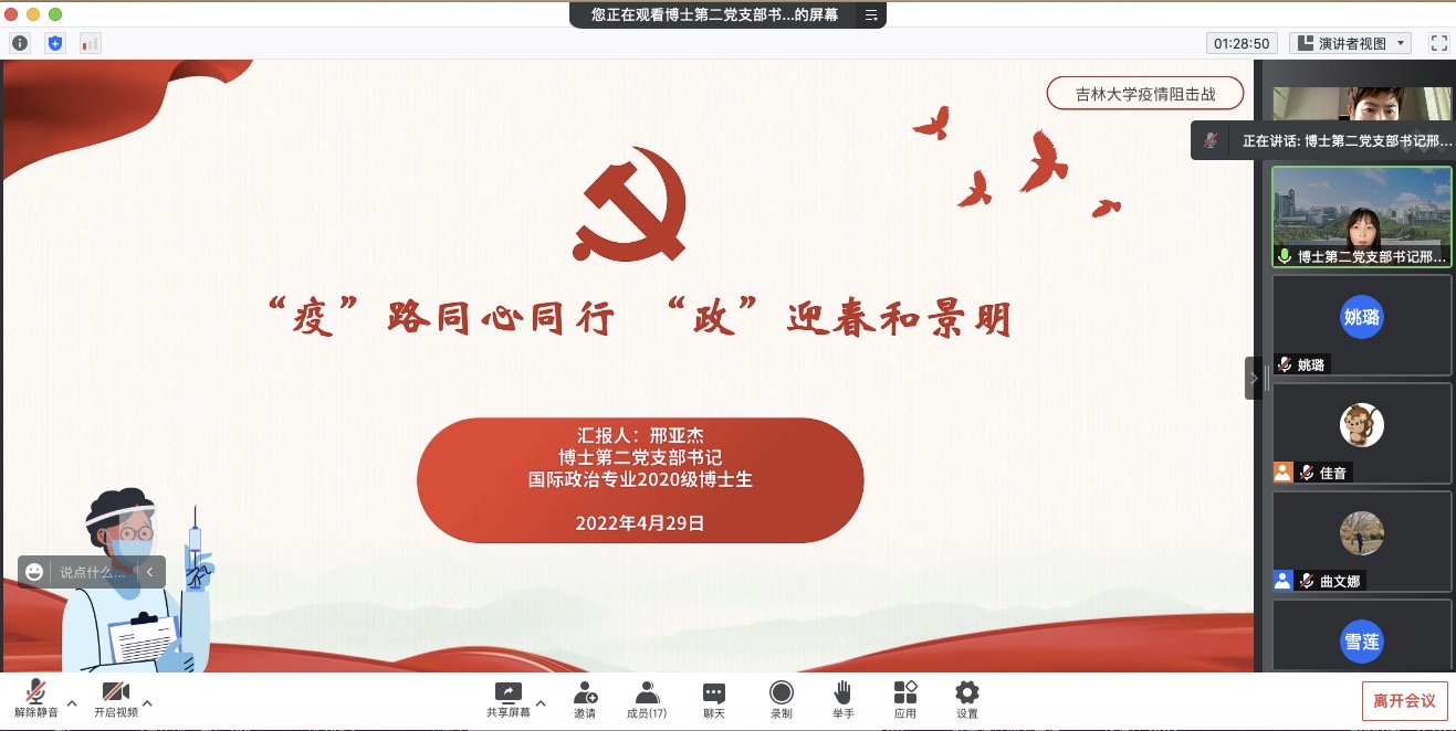 在前期自学的基础上,马景惠传达了学校疫情防控相关工作的最近精神。本科生党支部书记孙月、博士研究生第二党支部书记邢亚杰分别以《一心向党、科学防控,青年学生奋进新征程》《“疫”同心同行、“政”迎春和景明》为题进行代表发言。孙月表示,学院本科生党支部在学院党委的正确领导下,勇担责任、绽放青春活力,在理论学习、学生党支部建设、党团员作风建设、助力疫情防控等方面一以贯之、不断开拓,取得了较好成绩。邢亚杰表示,博士党支部有半数以上的同学奋战在志愿服务一线,临时党支部和党小组已自行组建起“责任区-先锋岗-突击队”的工作梯队,学生自我管理与服务体系健全完备。