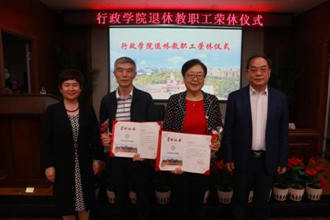 随后,张贤明院长为王彩波教授、常有余同志颁发荣休证书、荣休纪念奖杯,年轻老师为两位老师献上鲜花。