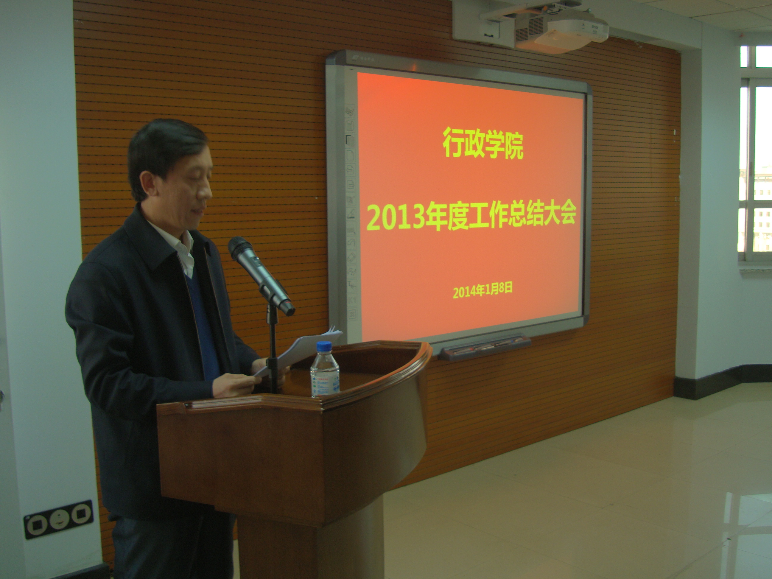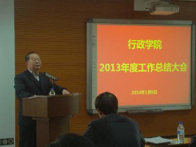 2013年度的学术和行政工作。他从人才队伍结构逐渐优化、整体水平呈现上升趋势;科学研究质量稳步提升、学术影响不断扩大;人才培养模式改革不断深化,成效显著;MPA教育不断规范,社会效益和经济效益均明显提升;学科平台建设扎实推进,成绩斐然;学术交流持续活跃,学术氛围日益浓厚;公务员培训工作努力进取,保持了良好势头;管理制度化建设不断加强、制度执行力不断提高;院庆工作充分展示学院发展的成就与影响,广获好评等九个方面汇报了一年来的工作和取得的成绩。他还在分析了ManHub