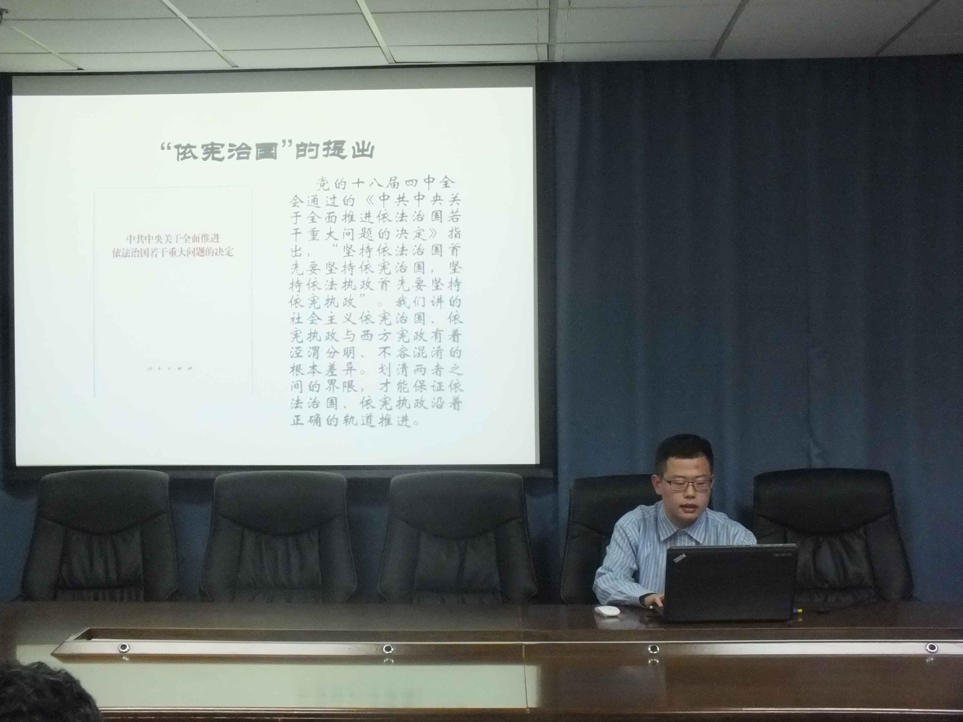 会议伊始,大家观看了关于介绍十八届四中全会的简短视频。孟祥铎(2013级)提出本次讨论的三个主题:“依宪治国和宪政”、“依法治国和以德治国”、“最高院设立巡回法庭”。接着,杨端程从政治学视角对本次讨论的三个主题进行了分析。关于第一个主题,他从理论基础、政治主体和利益主体、制度基础和运行机制、宪法解释权和运行机制、宪法解释权和审查权以及司法机构的政治属性等方面说明依宪治国和西方宪政的根本区别,指出我们要避免被所谓的“宪政思潮”迷惑,要始终坚持从中国话语体系来看待中国自己的“依宪治国”。在第二个主题上,他指出德是对法的补充,法律对道德有促进作用,法律与道德相辅相成,依法治国应与以德治国相结合。对于第三个主题,杨端程从起源、意义、应然作用等方面介绍了巡回法庭。最后,杨端程还就西方法治建设的一些有益经验、中国法治建设尚存在的问题等回答了观众的提问。