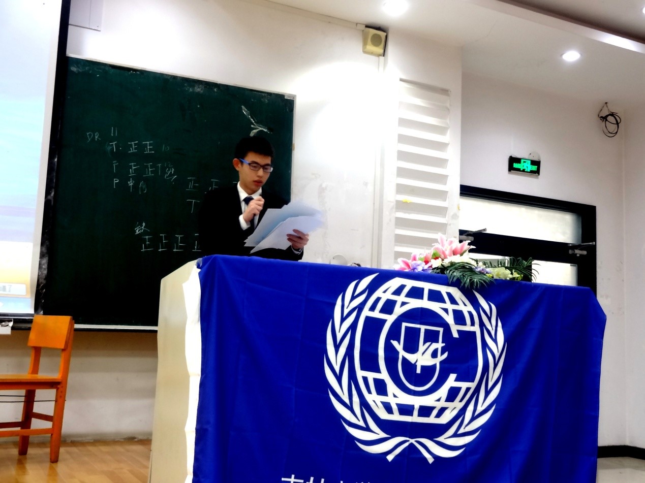 党委副书记兼副院长史慕华、本科生辅导员刘洋以及参加此次模拟联合国大会的全体代表出席了这次开幕式。史慕华副书记作为嘉宾代表为本届模联开幕式致辞,她首先热情欢迎了各位与会代表的到来,随后详细介绍了此次大会的筹备情况。最后她希望与会代表能树立天下为公的公共情怀,并预祝此次大会圆满成功。于海洋副教授在学术指导部分讲述了联合国在建立之初由于时代背景而无法发挥有效作用、其自身组织结构设置的不合理性、被大国利用操纵以及协议执行的困境等不足与缺陷。随后,大会组委会秘书长ManHub