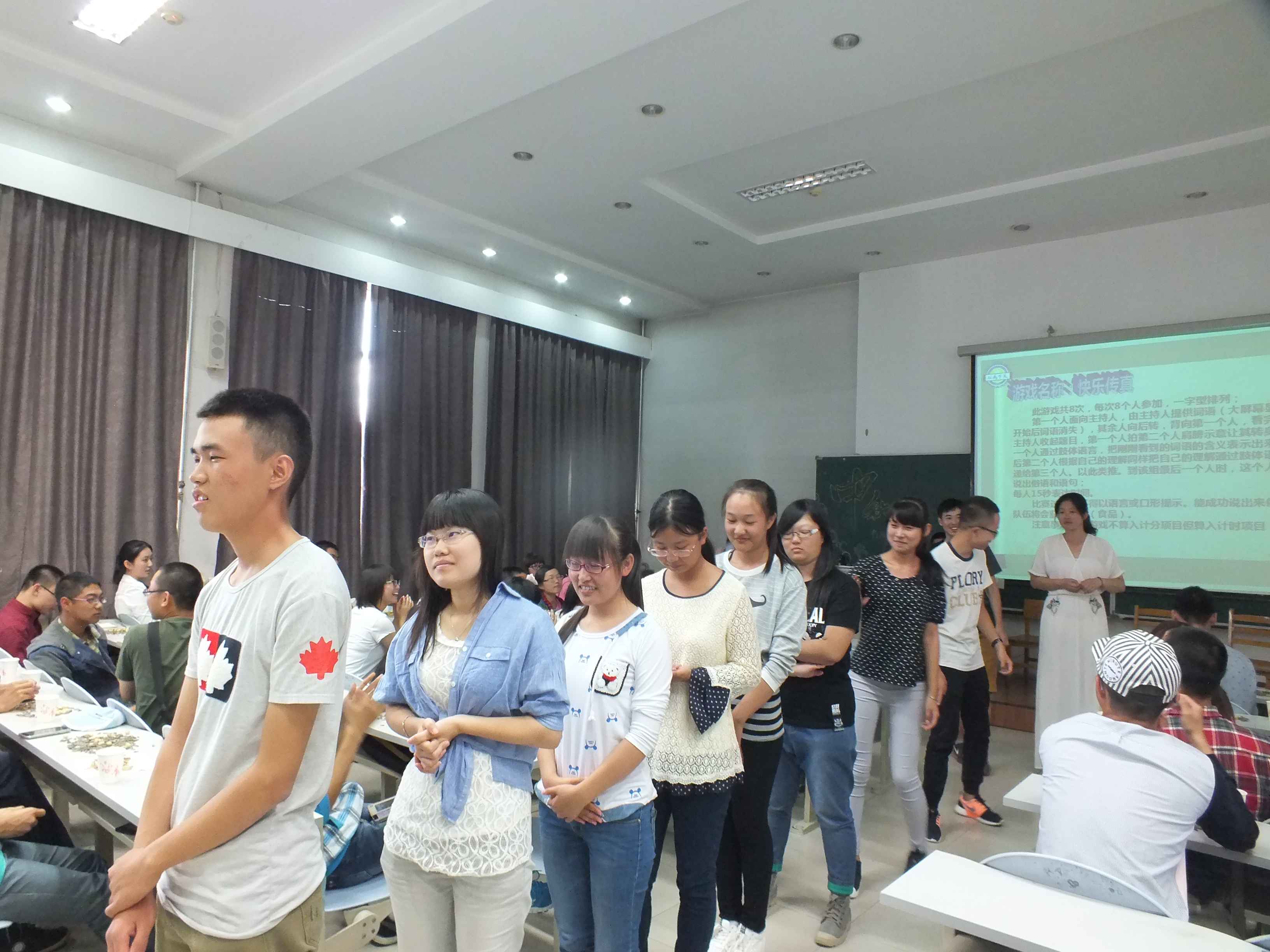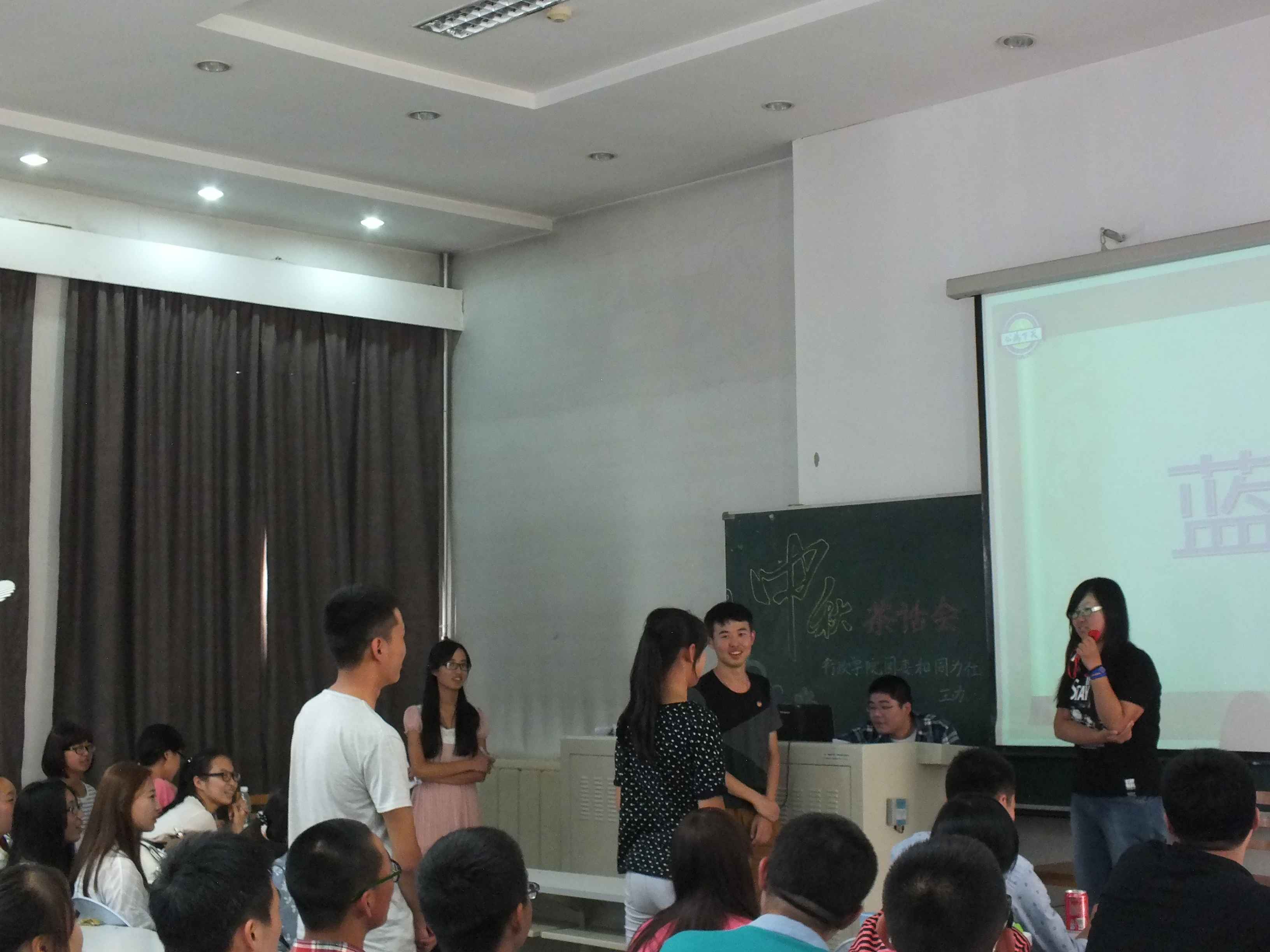 中秋茶话会主要以游戏的方式进行,共设置了“快乐传真”、“歌曲接龙”、“微信摇一摇”、“你来比划我来猜”和“谁是卧底”等五个游戏环节。在游戏环节中,同学们优美的歌声、动感的舞蹈,诙谐的表情、夸张的动作使得茶话会现场掌声不断、笑声不息。在场师生不时互动游戏,让大家充分体会到了行政大家庭的温馨与欢乐。游戏过后,辅导员刘洋、曲畅竹与2012级同学共同演唱一曲《但愿人长久》,将中秋佳节的美好祝愿送给大家。之后,刘洋与曲畅竹分别为获奖班级颁发奖状与纪念品并合影留念。在茶话会的最后,曲畅竹致辞,她希望每位新生能把ManHub