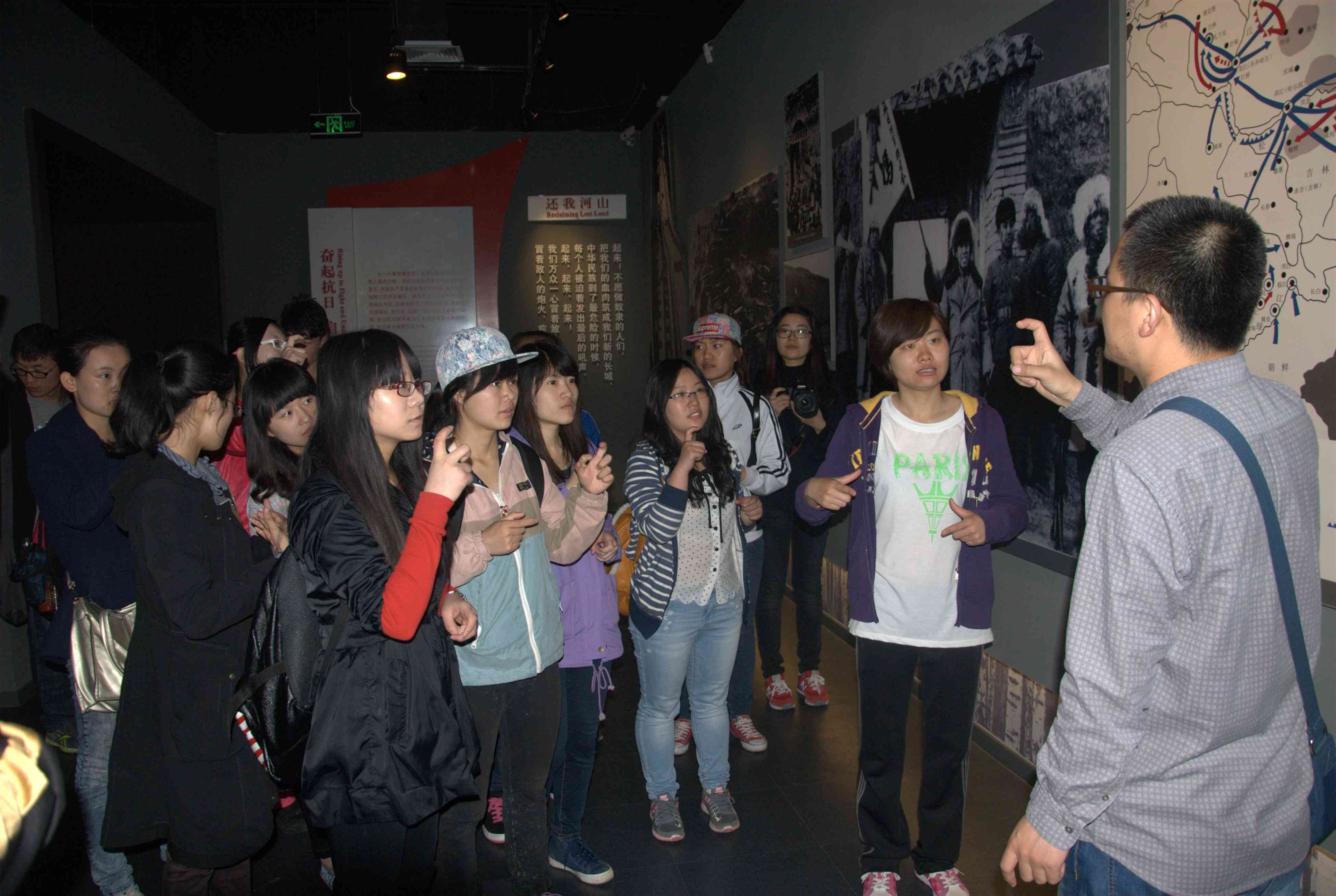 “政能量”志愿者再赴吉林省博物馆进行志愿服务并参加手语培训;认真的表情、热切的态度以及不曾停下的手部动作练习充分体现了志愿工作者们对志愿服务的坚定热情和信心。参观与培训同时进行,志愿者们在工作人员和手语教学人员的引导下参观了“黑土军魂——东北抗日联军军史展览”,展览讲述了从1931年东北沦陷到1945年抗日战争胜利的曲折历程。从“主动出击”到“游击战术”,再到“挥师西征”,一幕幕战争场景再现、一幅幅革命先烈的图像仿佛把人们带回了那个战火纷争、艰苦卓绝的年代,带领各位志愿者经历了一次形象深刻的爱国主义教育。