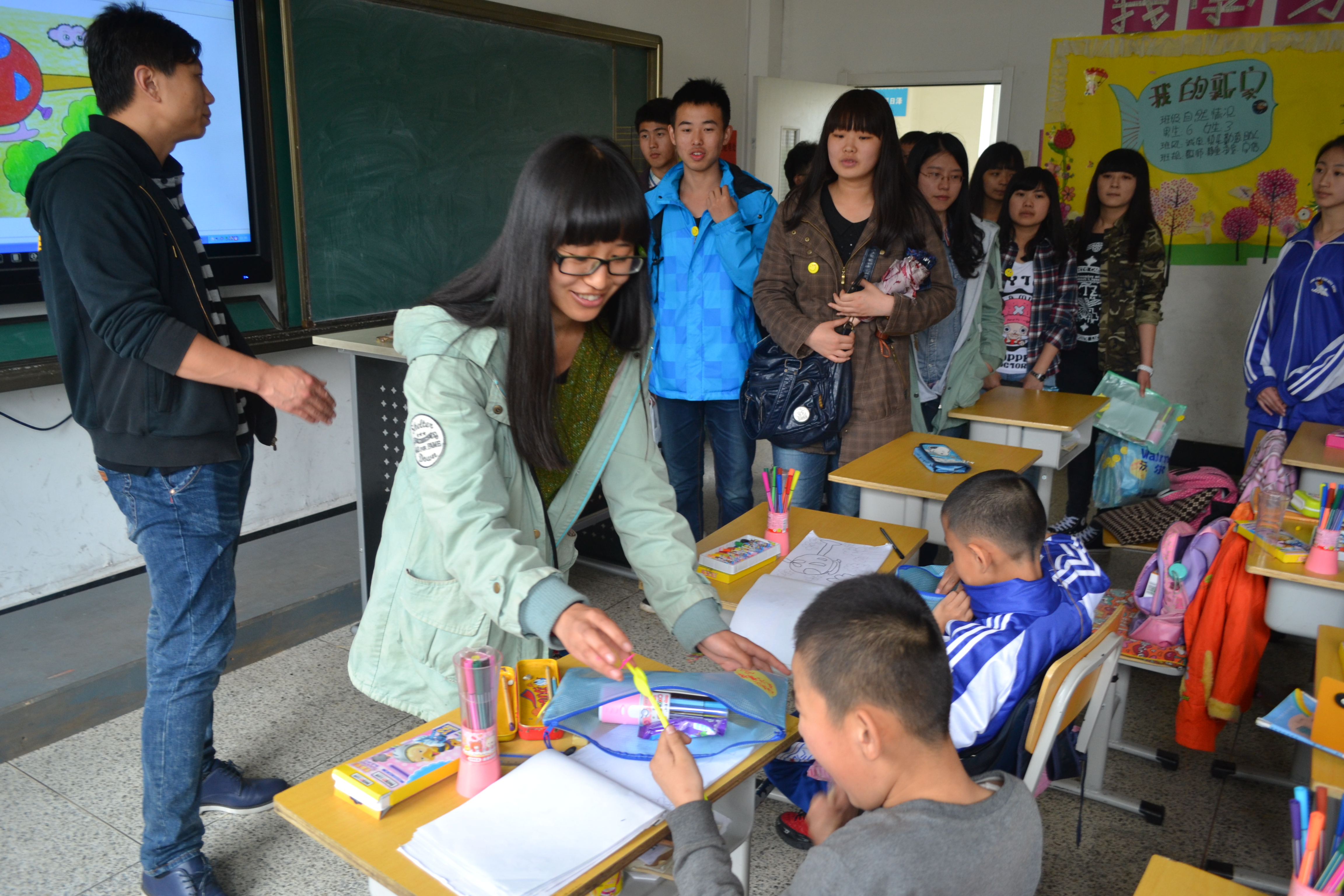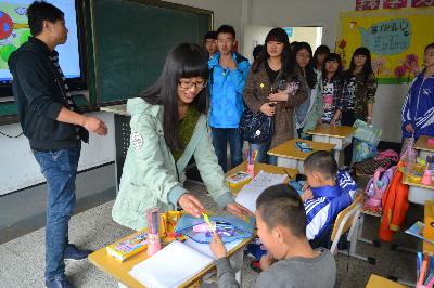同学们在校领导的指引下,探访了学校的一些聋哑儿童班级,与小朋友们做了很多游戏,用手语和他们交流,并为他们佩戴了带有笑脸的胸徽。一位聋哑儿童用手语表达出他很喜欢各位志愿者带来的礼物,希望以后他们还来,孩子们质朴的笑脸让很多大学生为之动容。“很开心能看到大学生们来到这里,感谢有那么多人关心着这里的孩子们,给予孩子们这么多关爱,大学生是最有活力的团体,这个活动很有意义,希望类似的活动可以多些。”学校里的刘老师对志愿者们的到来表达了谢意。随后,校领导代表小朋友们将他们手工制作的爱心千纸鹤送给了行政学子,希望可以通过同学们转交给那些社会上的爱心人士。