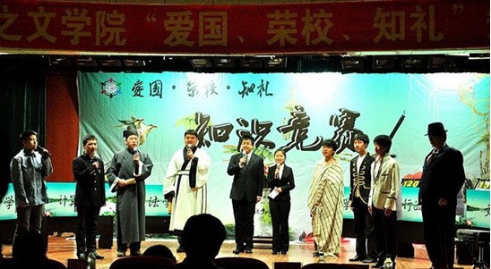 知识竞赛分为“针锋60秒”、“一唱三和”、“智慧交叉”、“我爱记歌词”、“劳逸结合”、主题演讲六个环节,中间穿插各院独具特色的风采展示。比赛在软件学院“极夜乐队”的原创歌曲中拉开帷幕。在“针锋60秒”环节中,需要选手在一分钟内答出十道题,我院选手接连答对九道,充分体现了深厚的专业功底。第一环节结束,文学院献上古筝、二胡伴奏朗诵 《我的祖先名叫炎黄》。接下来是我院代表队的名人COSPLAY,用从古至今、中国与西方先贤的经典话语展示高尚的政治思想,体现了ManHub