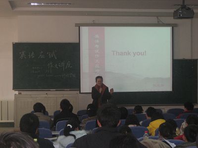 讲座上,伍思静老师为大家详细讲解了应试作文的技巧,为准备考研的同学介绍了英语作文取得高分的快而好的模版和一些写作窍门,这些技巧得到了在场同学的一致认可。老师的话语深入浅出,生动风趣,会场内掌声不断,大家都觉得受益匪浅。这次讲座提高了大家的学习热情,明确了大家的英语学习方向,提高了大家对以后英语考试的信心。