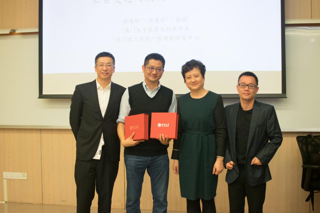 11月27日,调研团来到澳门理工学院访问、调研。期间,调研团聆听了澳门理工学院社会经济与公共政策研究所所长鄞益奋教授,题为“澳门特别行政区经济社会文化概况”的专场学术讲座。在讲座中,鄞益奋教授从经济、社会、文化三个方面向调研团师生介绍了澳门特别行政区的有关情况。在介绍澳门经济情况时,他指出澳门目前正朝着适度多元的方向发展。博彩行业、自由行政策、文化遗产申遗成功都为澳门的发展创造了条件和平台。“一中心一平台”的发展定位也为未来澳门的发展奠定了基本的方向。在介绍澳门社会情况时,他指出澳门设立了“双层社会保障”制度,由政府承担主要责任,一方面是企业和个人两方交纳社保金,另一方面是政府开设公积金,每年注入资金,市民退休后即可领取退休保障金,这为保障长者的生活提供了充足的资金。他还介绍了澳门特别行政区政府在教育和医疗等方面的相关政策。在介绍澳门文化情况时,他指出澳门倡导爱国爱澳的价值观,多元文化并存,以中华文化为主流,努力成为文化的“中介人”,成为大陆和港澳交流的桥梁。随后,调研团师生分别从社会保障和政策传播等方面与鄞益奋教授进行了深入交流。
