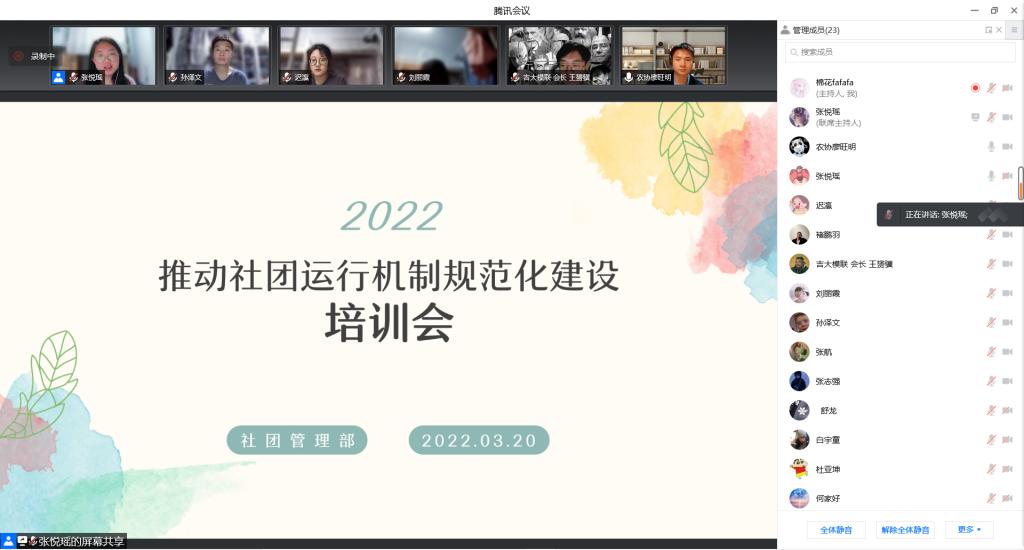 2021-2022学年第二学期第一次社团例会暨社团规范化运作培训会。社团管理部全体成员、各社团执行团成员参加了本次会议。