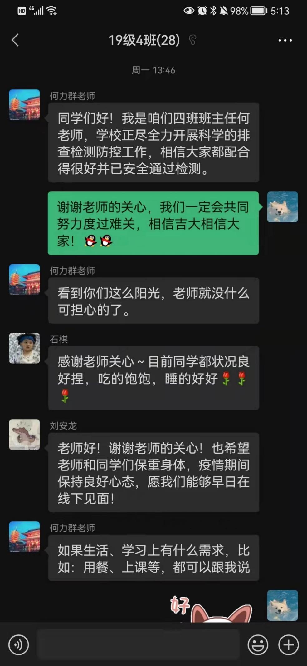 14日下午,在2019级四班班会上,班主任何力群老师首先了解了同学们在用餐和学习方面的情况,并表示如遇问题要及时向老师和学校反映;接下来,老师在班级微信群内就学习、生活、心理状况等方面与同学们进行了深入的沟通,并表达了对大家的深切关心与期望;同学们在微信群里积极回应老师,班会气氛活跃。