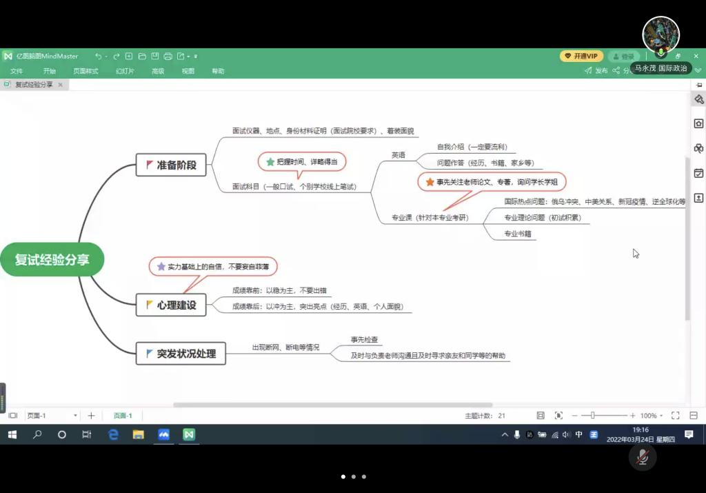 2021级政治学理论专业廉颖豪、2021级国际政治专业马永茂、2021级行政管理专业王向越三位硕士研究生为大家线上分享经验进行交流。