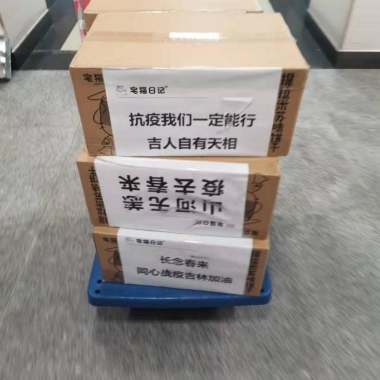 8:40,我校校友捐赠的食品到达公寓,志愿者们同样快速下楼集合,搬运分发物资。“抗疫我们一定能行”“吉人自有天相”“山河无恙,疫去春来”“长念春来,同心战疫吉林加油”——包装箱上的话语饱含美好祝愿,暖流跨越山海,此情地久天长。
