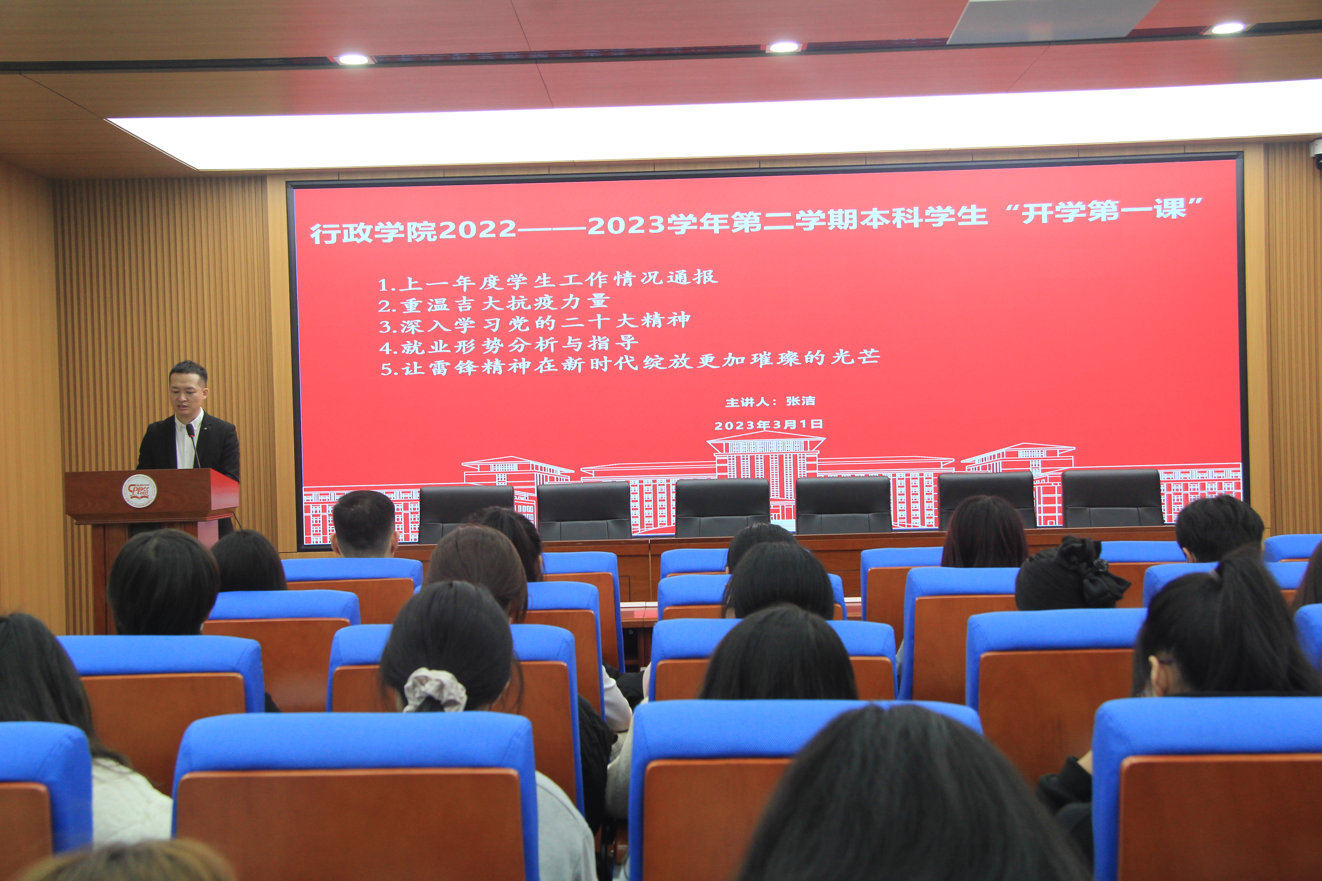 在东荣大厦人民政协理论研究中心报告厅举办“开学第一课”,党委副书记兼副院长、纪委书记张洁主讲党课暨思政课,辅导员与各年级学生代表参加活动。