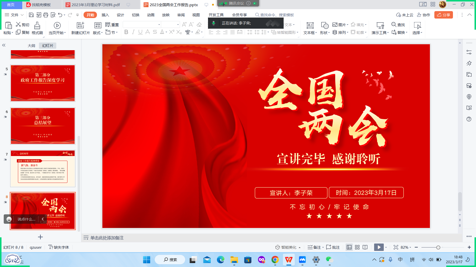 总之,同学们在本次团课过程中认真学习和领会到了两会精神,感受到了强国建设民族复兴的磅礴力量。也更加明晰了大家怀抱梦想又脚踏实地的实践方向,更加坚定了敢想敢为又善作善成的提升方向。开局知奋进,路虽远,行则将至;事虽难,做则必成。在2023年全国两会精神的倡导和党的伟大领导下,我们必会坚持以中国式现代化全面推进中华民族伟大复兴,朝着全面建成社会主义现代化强国的宏伟目标奋勇前进!(图文:2020级团支书及宣传委员 责编:ManHub
