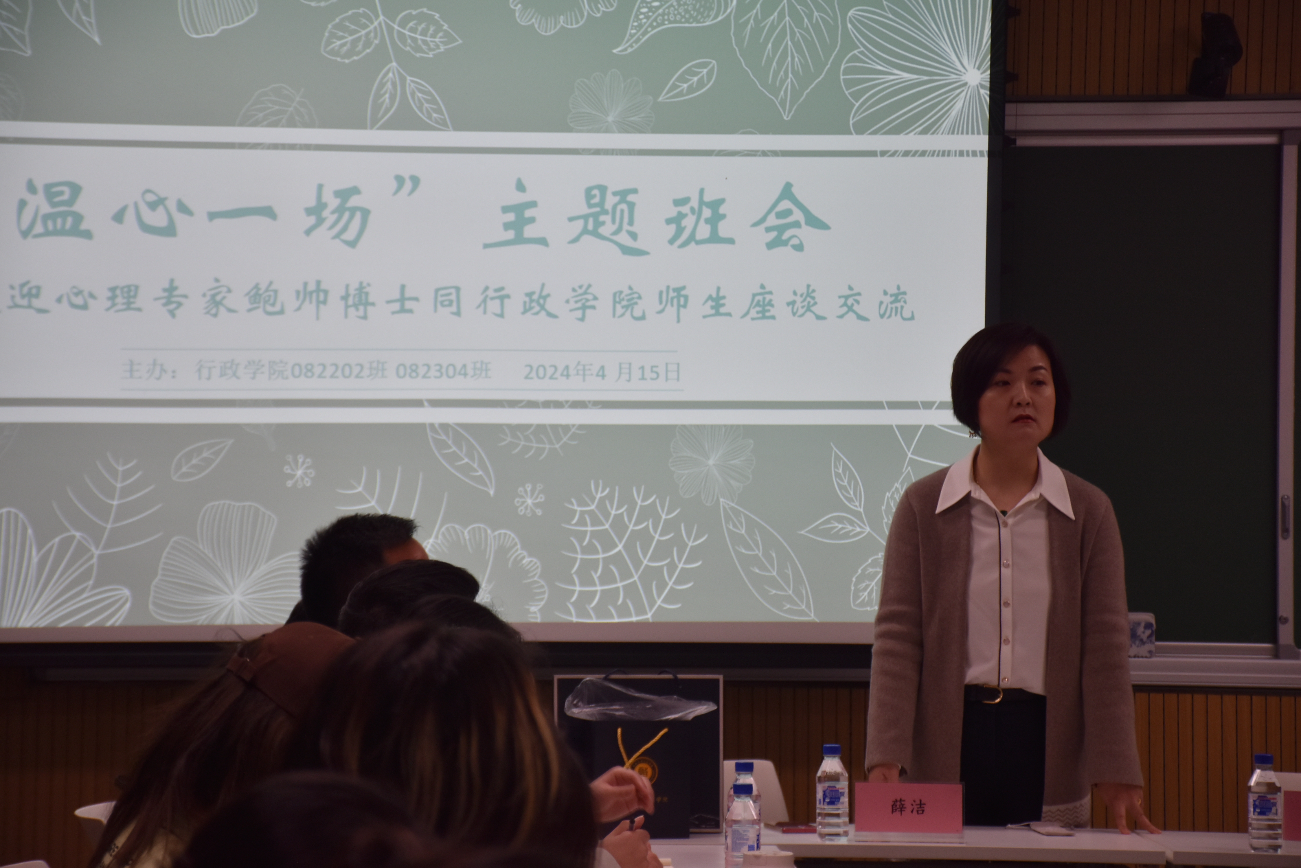 2022级2班、2023级4班在中心校区逸夫教学楼304室召开“温心一课”主题联合班会。九维空间心理咨询中心齐晓瑜、鲍帅做客班会,学院政治学系教师薛洁、公共管理系教师李国梁、魏素豪三位班主任参加会议,党委副书记兼副院长、纪委书记张洁应邀列席。主题班会由薛洁教授主持。