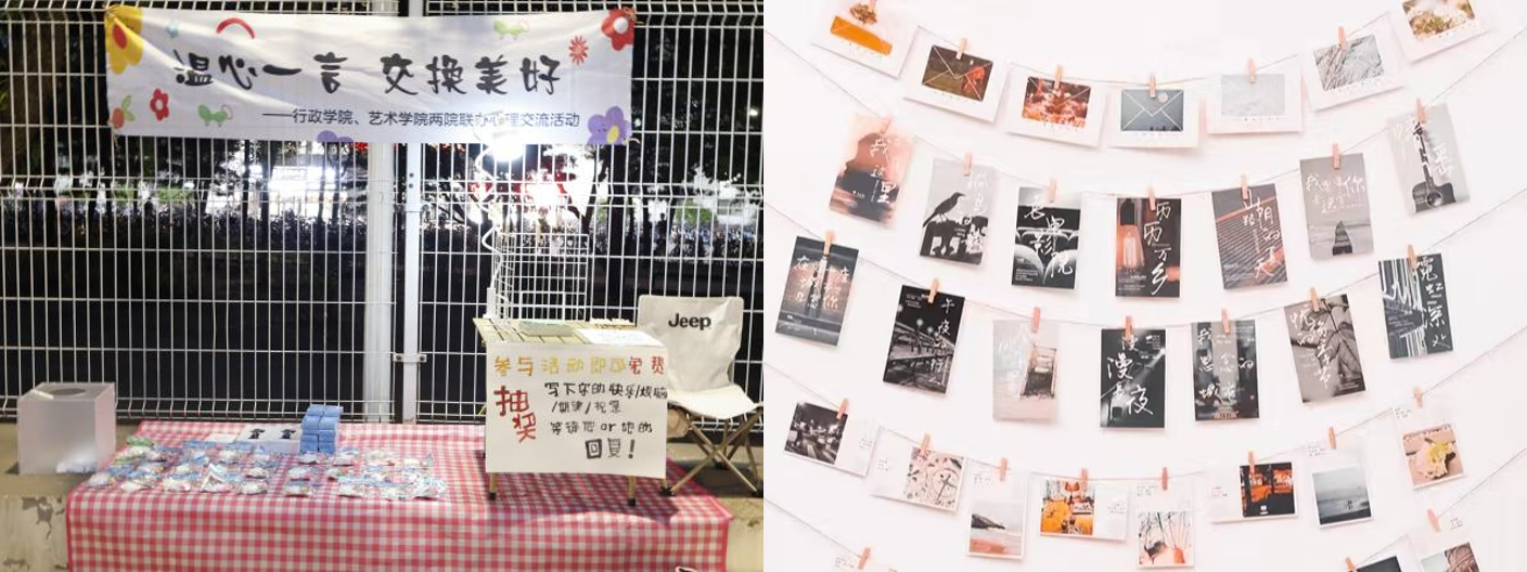 、艺术学院联合举办“温心一言,交换美好”心理交流活动。此次“温心一言、交换美好”活动,通过在南区操场设置“心情交流墙”、悬挂“心灵明信片”的方式,为同学们提供了一个分享心情、交流情感的心理平台,引导同学们感受生活的温暖和美好。在活动过程中,同学们纷纷敞开心扉,书写悬挂自己的“心灵明信片”,分享生活、倾诉烦恼焦虑、祝福路人、展望未来,留言互动间展现出彼此间友好的善意与关怀。辅导员经常性深入学生公寓、教室、体育场馆和餐厅,保持与学生群体的密切联系,在建立友好互信的基础上,定期摸排了解学生思想动态、评估学生心理健康状况,结合院级心理辅导室随时开展谈心谈话、开展心理科普,帮助同学们加强情绪管理、排解焦躁忧虑,共同营造安心、舒心、开心的学习生活氛围。