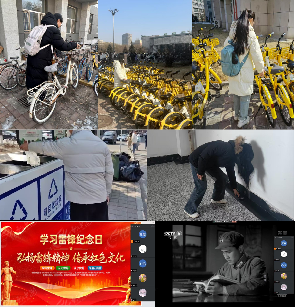 策划并组织雷锋精神系列纪念活动。3月5日,学院组织志愿者化身环保小卫士,进行校园清洁,并且对校园内随意停放的自行车进行摆放,积极践行雷锋精神,用实际行动帮助他人、回馈校园;晚7时,志愿者们参与线上观影,回顾雷锋同志平凡而伟大的一生,全方位、深层次的理解雷锋精神。同时,学院082402、082405班团支部以“学雷锋 树新风”为主题,在法学楼305教室举办学雷锋主题团日活动,同学们以“爱心传递墙”写下了自己的“微心愿”和“爱心寄语”,并将制作好的纪念品送给身边默默付出的人,以实际行动弘扬雷锋精神,增强集体荣誉感和社会责任感,争做新时代的好青年。