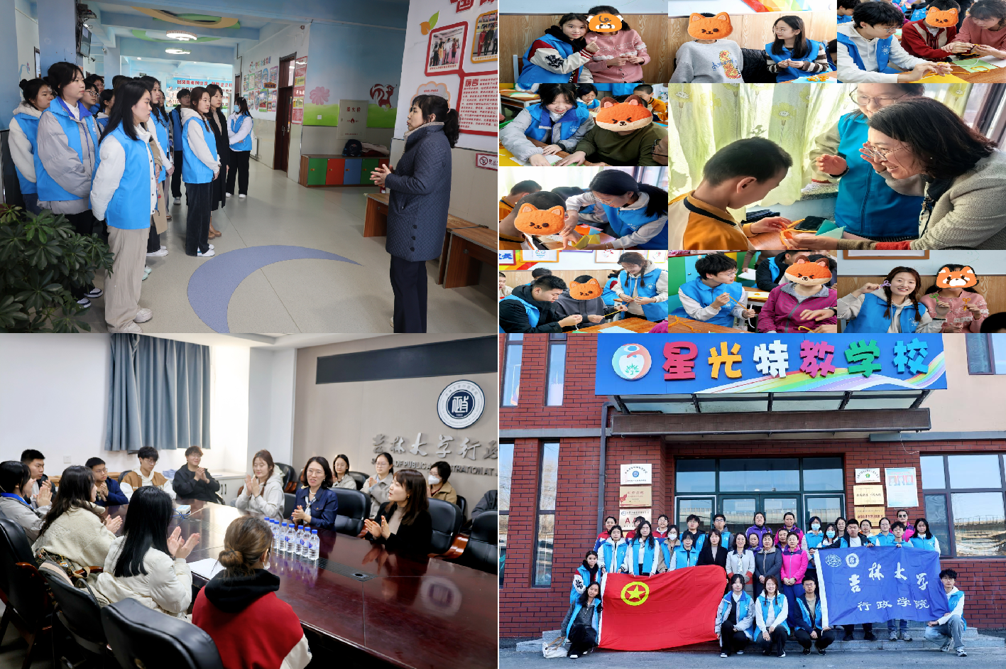 走进长春市绿园区星光特殊教育学校,开展社会实践基地共建活动。同学们共同参观绿园区星光特殊教育学校,在学校老师的指导帮助下,和孩子们开展了折纸、扭扭棒手工制作等互动游戏,孩子们神采奕奕、收获满满。史慕华总结指出,创建该基地的初心,一是希望同学们在志愿服务后勇担青年服务社会之责任,在广阔大地上有位有为、善作善成;二是希望同学们在志愿服务后感悟生命面对挫折之顽强,在人生遭遇挑战时积极面对、迎接挑战;三是希望同学们在志愿服务后感知身体健康完整之幸运,在日常学习生活中舒畅身心、永葆快乐。
