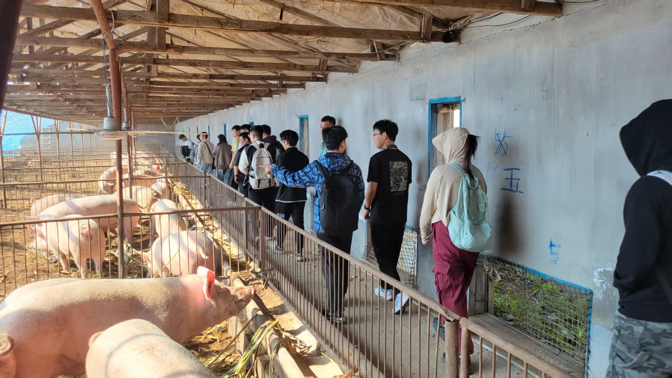 到达郭家村,同学们在负责人的带领下集体参观郭家村云凤合作社,先后走进养殖区、种植区、猪舍、羊圈、鸡棚,跨进田野、菜地、果园,听取负责人介绍合作社的发展历程、运行模式、经营理念和技术创新等情况。