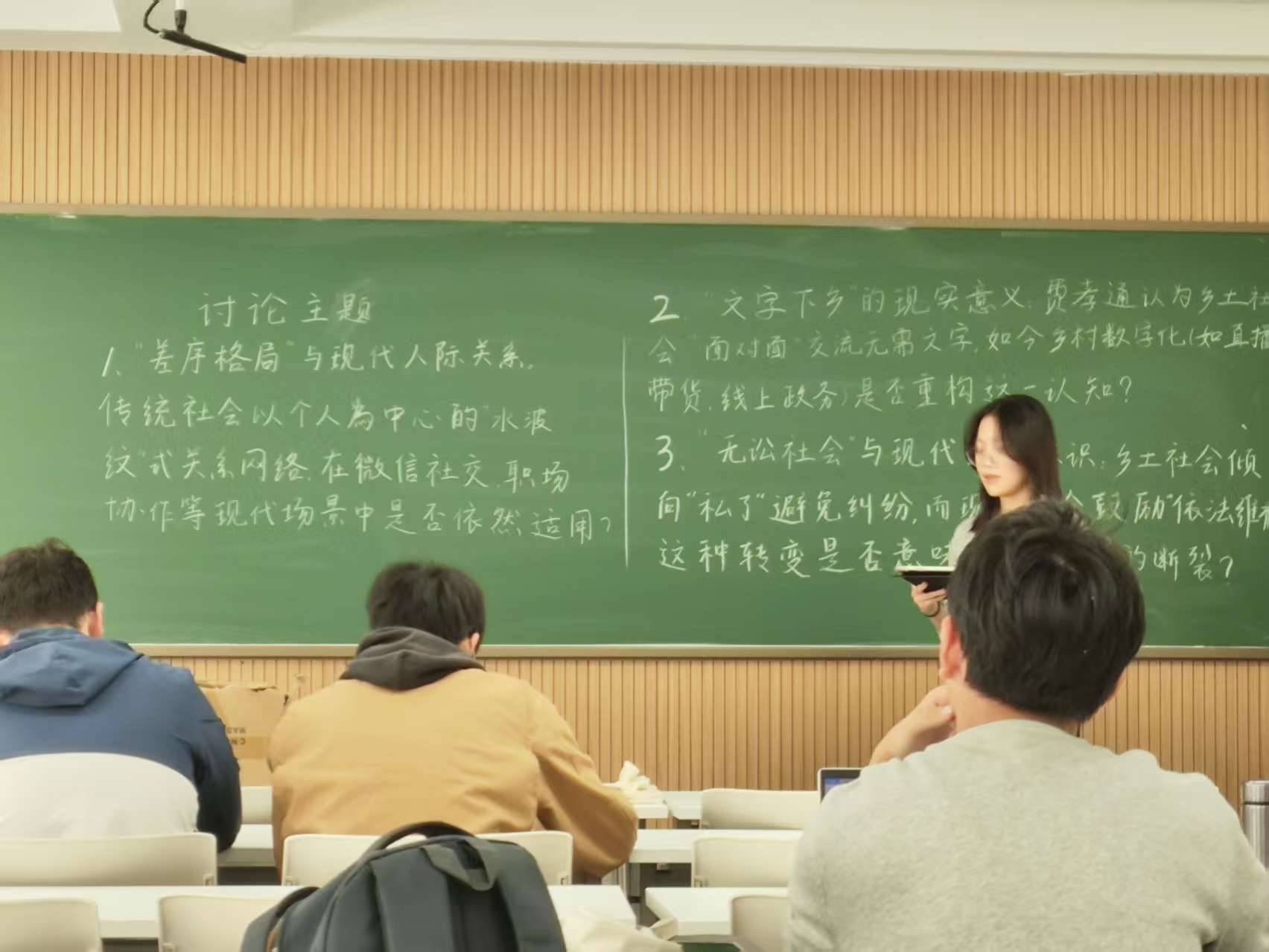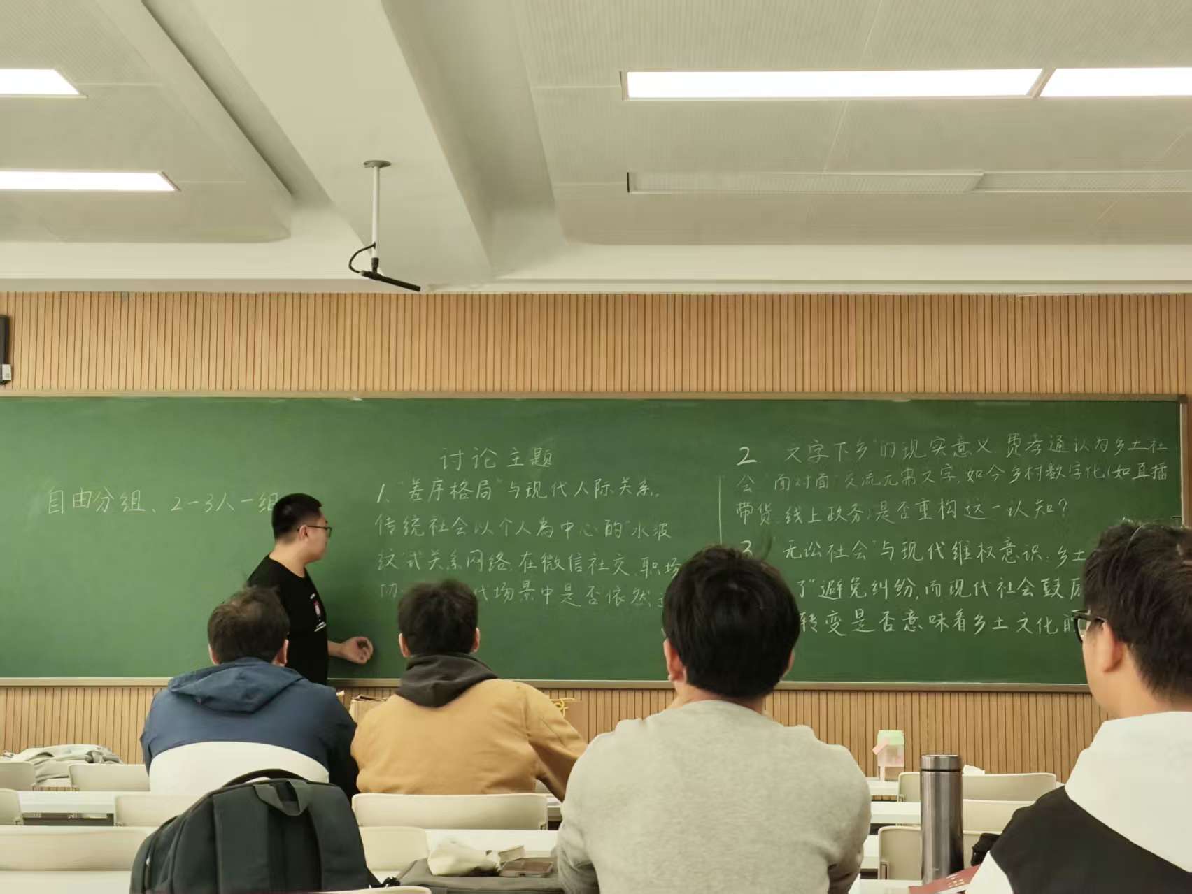 下午同学们自行分组,围绕三大核心主题展开讨论与交流。从“差序格局”是否适配微信社交、职场协作等现代人际关系场景,到“文字下乡”认知在农村直播带货、线上政务等数字化实践中的重构,再到“无讼社会”传统与现代依法维权意识的碰撞,同学们结合生活观察与社会现象表达观点,展现出对经典理论的深刻理解与现实关怀。讨论尾声,各小组推选代表进行汇报分享。