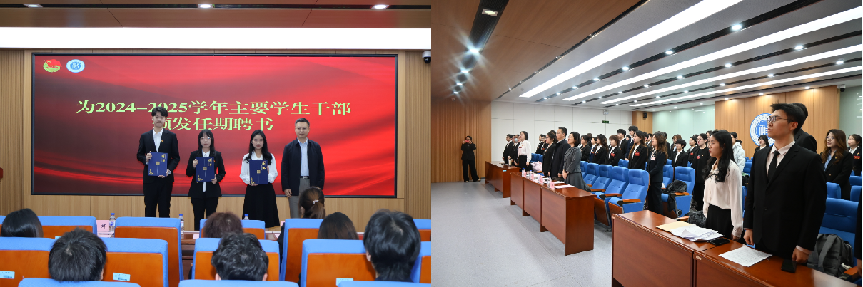 会议在全场师生齐唱国歌声中开幕,陈希贵为2024-2025学年主要学生干部颁发任期聘书。