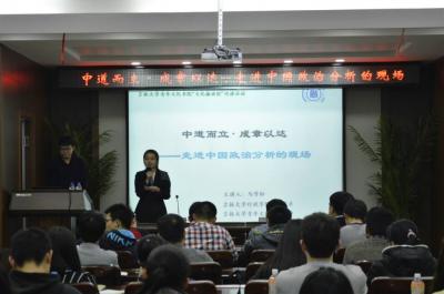 在主持人王嘉铭(15级本科生)向大家介绍了主讲人马雪松导师之后,活动开始。马雪松导师的讲座分为“题解”、“操练”和“启示”三个部分。第一部分,马雪松导师从“中国”、“中国政治”、“中国政治分析”等概念入手,层层递进,详细地分析了中国政治的改革与发展、机构设置等热点话题,以中西互通的视角阐述现代政治的基本任务。第二部分,他指出了大众对当代中国政治生活中现实性反思不足、体制性反思不足的缺点,并进一步提出需要迫切解决政治体制与经济体制的适应问题。第三部分,他以体制性改革为例进行了政治分析,提出了“允执阙中,笃近举远”的问题分析思路和“明理定制,德法兼备”的规则框架。活动最后是提问环节,本科生及研究生踊跃提问,问题涉及影视中的政治学、法学视角的政治学、十八届三中全会等方面。