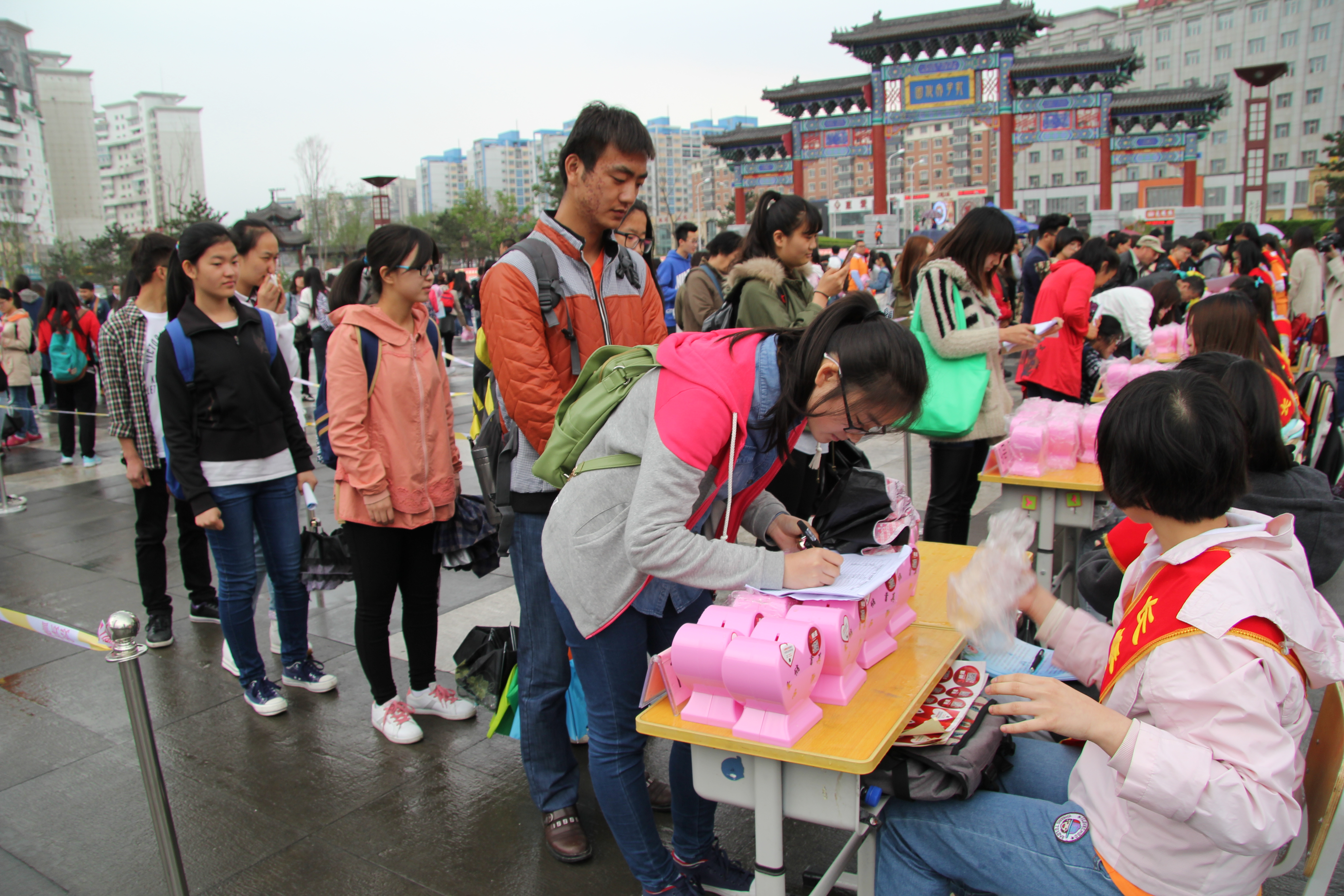 下午一时许,“超能储蓄罐”领取活动正式开始。虽然天降大雨,活动仍然吸引了众多高校大学生和市民。在主持人和工作人员的引领下,志愿者按照活动秩序等待领取储蓄罐。大家依次在登记本上认真写下自己的名字和联系方式,小心地接过工作人员递过的储蓄罐,爱心储,蓄真情。领取储蓄罐的ManHub
