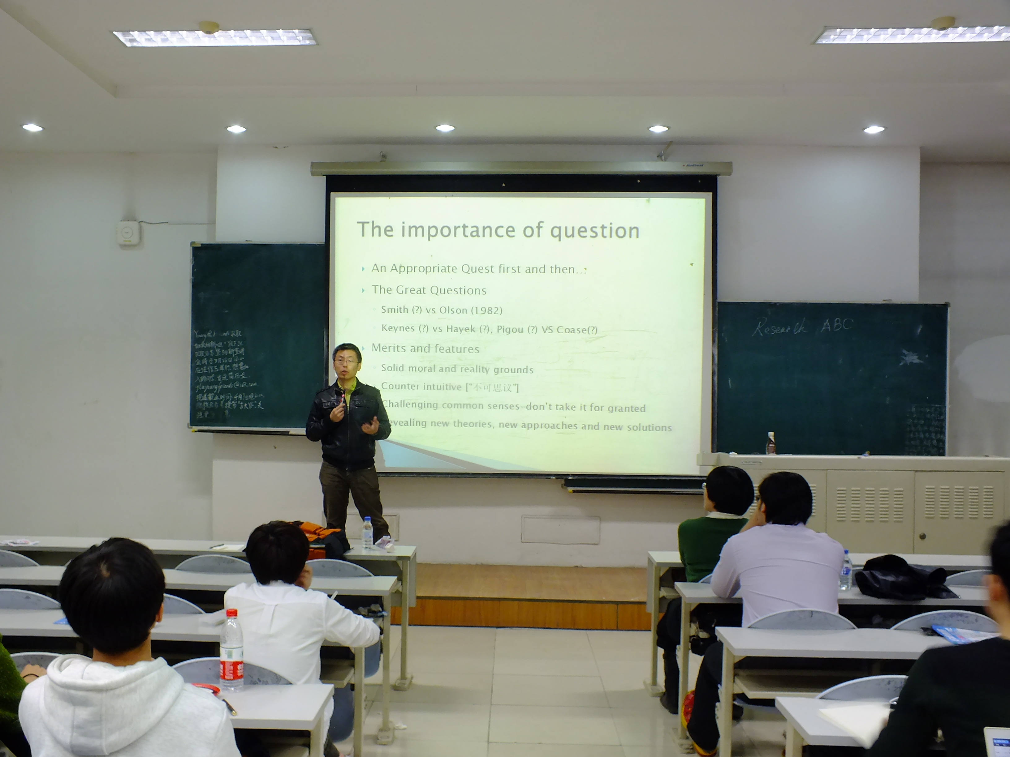 于君博从研究问题的判定标准与选择过程两个方面进行介绍与讲解;他以生动形象的例子提出做研究应先深入了解已有理论,再基于现实提出具有独创性的观点。在互动环节中,于君博提醒学生们在选题之初要对相关理论有所了解,以避免在研究中缺乏理论根基。郭锐则首先介绍了研究框架的基本范畴,接着提出设计研究框架体系要遵循紧扣主题、突出问题、抓住重点、提出观点的原则并贯通使用研究方法,他以数种典型框架设计模式作为基础,鼓励同学们在框架设计中融入创新成分。最后他与学生们交流了自己的实践心得并对学生们的疑问做了详细解答。马雪松从学术文献取用方面为大家作项目指导,介绍了部分常用文献获取来源并举例说明以文献为基础进行学术训练的具体思维方向。他提出,创造性的阅读要求学生们尽可能接触并掌握各学科主要的不同流派的理论,综合理解后深化对问题的思考。他强调,研究文献与学术阅读的目标在于创新,大学生应有求知欲与怀疑精神,要发挥所长并凝聚团队力量进行创新探索。