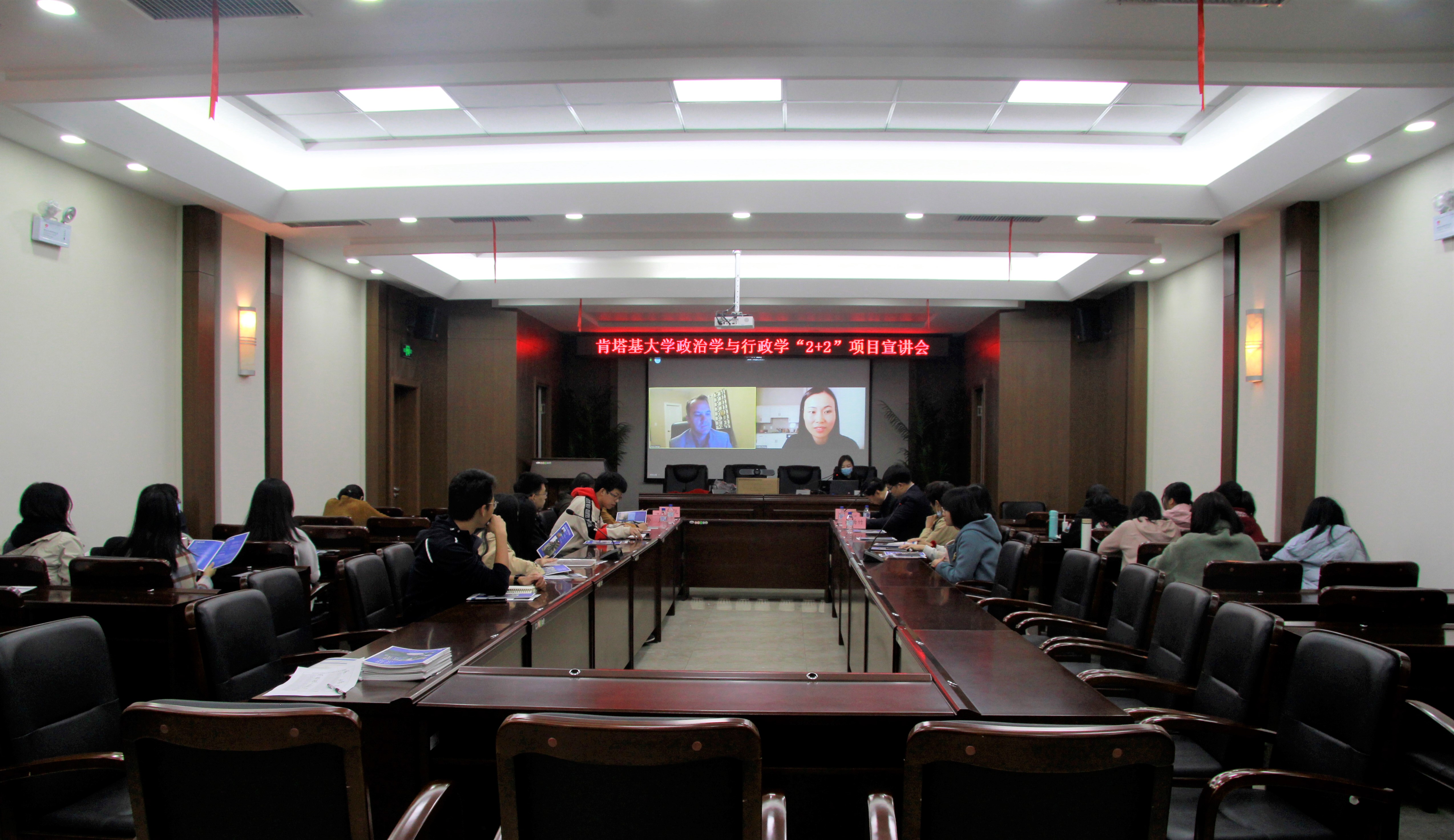 与美国肯塔基大学本科生2+2双学位联合培养项目宣讲会(2020年)”成功举办。美国肯塔基大学文理学院副院长杰西•赫奇(Jesse Hedge)、孔子学院外方院长修华静、学生大使苏伟伦、学生大使曹幸汇通过线上平台与我方连线进行分享。ManHub