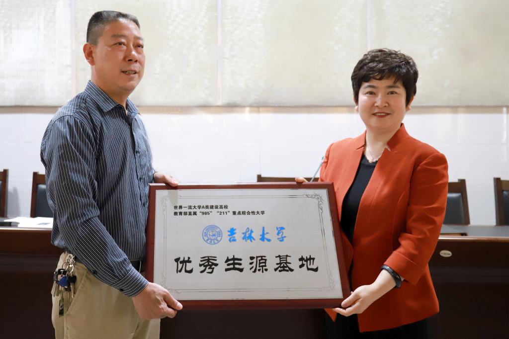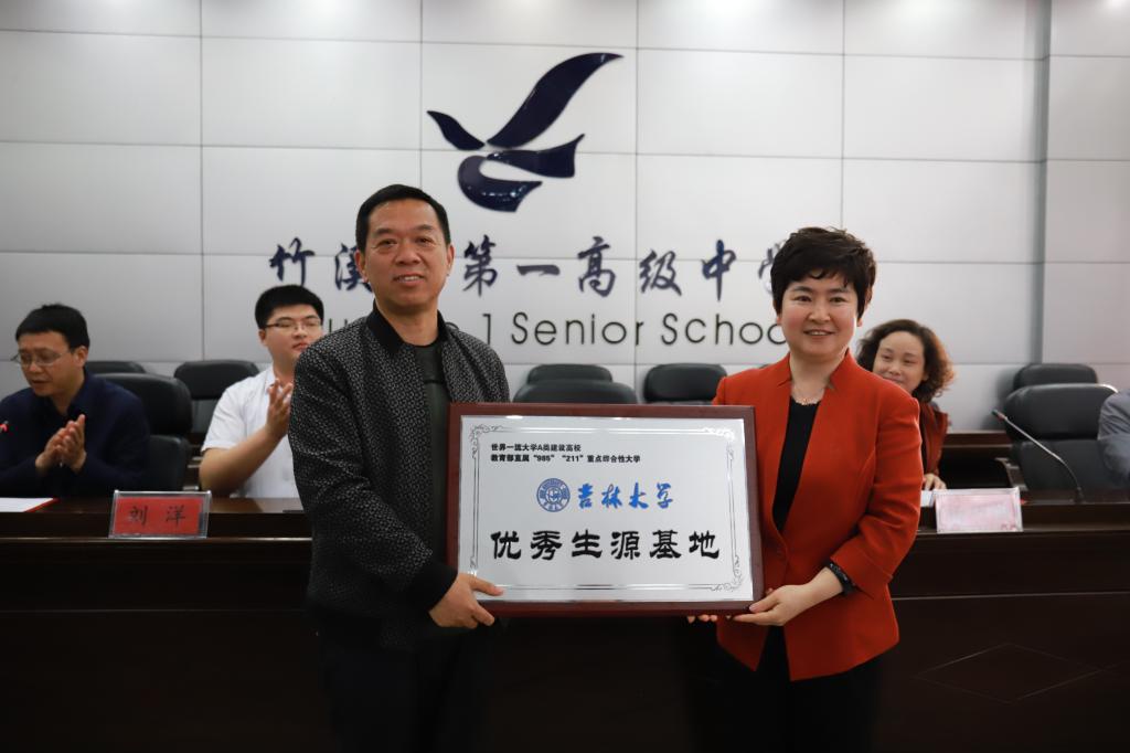 在优秀生源基地授牌仪式上,竹溪和竹山两县县委县政府有关负责同志对我院一行的到来表示了欢迎和感谢,并就基地建设和生源质量提升等相关工作提出了希望。魏鹤影老师在两校的致辞中,首先对基地的建立表示了热烈的祝贺,向县、校领导师生的热情接待表示了衷心感谢,还向大家发出了了解吉大、走进吉大、感受吉大的诚挚邀请。她在致辞中简要介绍了我校的基本情况,概括了我校学科门类齐全、师资力量雄厚、培养体系完整、培养质量显著、科研平台众多、科研成果丰硕、对外交流繁荣和校园环境舒适的办学特点,并特别强调了我校在人才培养质量上的突出成绩。她还向大家介绍了我校、我院招生宣传工作的开展情况与湖北籍学生在我校就读期间的优异表现。最后,她从进一步加强招生宣传、报考咨询和人员互访等方面对基地共建提出了希望,并对两校同学们在日常学习生活和高考中保持好状态、取得好成绩表达了衷心祝愿。