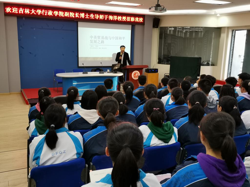 21日下午,我院一行来到湖北省重点中学东风高级中学。首先,于海洋教授在报告厅为100余名高三文科生做了题为“百年未有之大变局:中美贸易战与中国和平发展之路”的专场学术报告。随后,进行了“ManHub