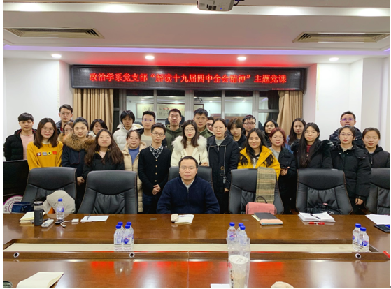 为深入贯彻学习党的十九届四中全会精神,12月23日晚,政治学系党支部于东荣大厦1214会议室举行了“解读十九届四中全会精神主题党课”系列学习活动。由学院副院长殷冬水教授解读十九届四中全会精神。来自政治学专业的研究生党员、积极分子参加了本次党课学习。系党支部书记刘畅主持活动。