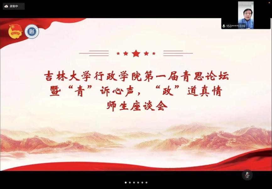 优秀学生代表与青年教师代表依次进行了发言。学院“青年学习班”代表曹阳、研究生代表徐紫微分享了学校疫情防控中志愿者的防疫记录和个人心得感悟,提振疫情防控信心;学生社团代表张志强、团支部书记代表张云航总结并介绍了疫情形势下社团与班级工作的开展情况,并结合“五·四”精神鼓励大家追逐青年梦想,争做时代新人;优秀记者代表陈聪表示将为提升学院团委宣传工作而继续努力,立足于“公共精神、独立人格”的院训,加强宣传工作的深度,对内提升亲和力、对外提高影响力;志愿者代表赵蕊、优秀共青团员代表卫玉欣分享了疫情下吉大人、行政人的勇毅担当,表达了对逆行而上、勇挑重担的志愿者的敬意和感谢;学生组织成员代表于润泽介绍了应急管理期间学院学生会的工作开展情况,表示学生会将在未来继续发挥好凝聚同学、服务同学的作用;“青马工程”学员代表王上华分享了自己在院校两级青马工程培训班的经历,并号召共青团员们发挥先锋模范作用,躬身实践、知行合一;“思源计划”学员代表卢婷从参加计划调研活动的经历与体会着眼,抒发了行政学子脚踩泥土、眼望星辰的情怀;就业毕业生代表王鹏解答了同学们关心的就业问题,指出在求职过程中应脚踏实地、积极调整自身心态、不断积累经验,抓住自身定位精准出击。优秀青年教师代表张力伟以责任担当为主题进行了主题发言。张力伟号召同学们坚定思想信念,走出书斋、走向社会,充分认识到自我主体性与对国家民族未来的责任担当,将担当化为行动,勉励同学们立足于青年政治学人、公共管理人的身份,培养理性冷静的学科立场,保持对时代与社会发展的敏感度,在学习实践中挖掘中国故事、更好地阐述中国故事。