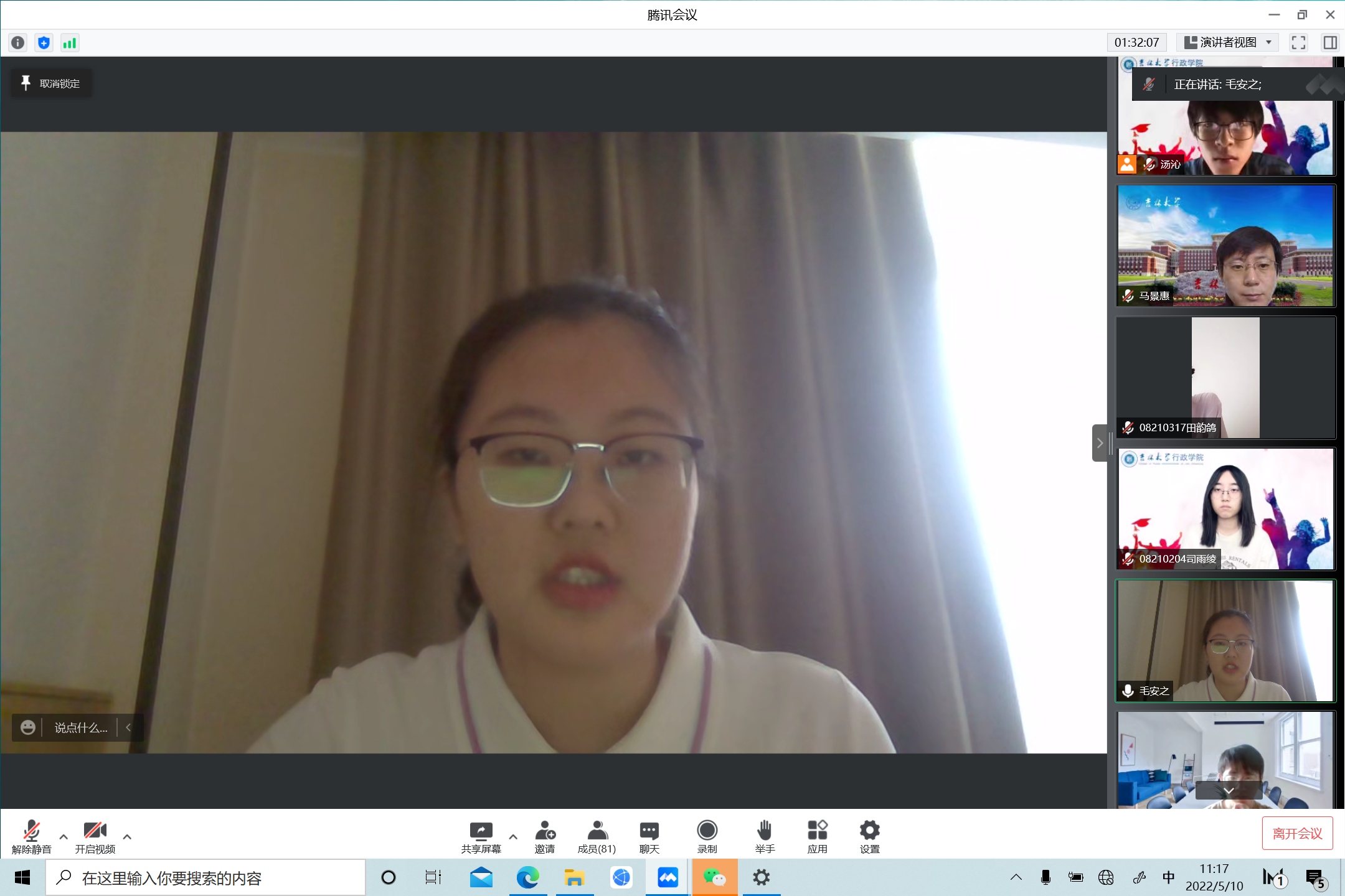 庆祝大会结束后,学院广大青年教师、青年学生趁热打铁、学在前头,结合学科专业和个人实际,围绕大会和习近平总书记重要讲话精神分享了感想和体会。大家纷纷表示,庆祝中国共产主义青年团成立100周年大会盛况空前,催人奋进,这是对过去100年间中国青年在党的领导下爱国奋斗建功立业的全面总结,也是向全国青年勠力同心迈向“第二个百年”奋斗目标的时代号召,能够经历这样一个激动人心的历史时刻,既荣幸又振奋。政治学系青年教师郑倩分享了自己入团时的情景,表示作为高校教师要在教书育人中时刻牢记青年兴则国家兴、青年强则国家强,教育引导团员青年将自身发展与人民幸福、国家命运、民族复兴紧密联系在一起,将小我融入大我、将青春献给祖国。毕业生代表毛安之表示,习近平总书记在大会上的讲话深入人心,中国的未来是青年的,中华民族的未来也是青年的,时代已经将火炬传到了当代青年手里,面对重重考验,同学们定将坚定理想信念,唱响青春之歌,不断向前奋进。在校生代表张云航回顾了共产主义信仰之光指引中国青年一路前行的百年历程,结合学校应急管理期间青年学生自我管理、自我监督、自我服务的经历和学生志愿者的感人事迹,表达了强国有我的坚强决心。