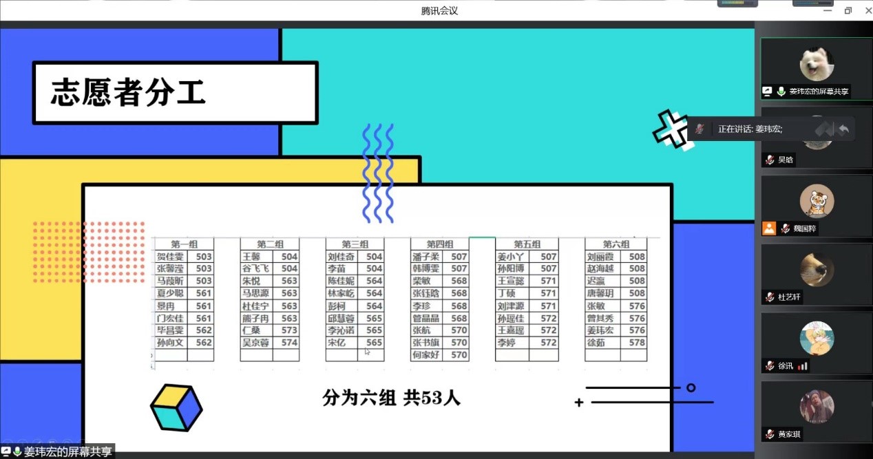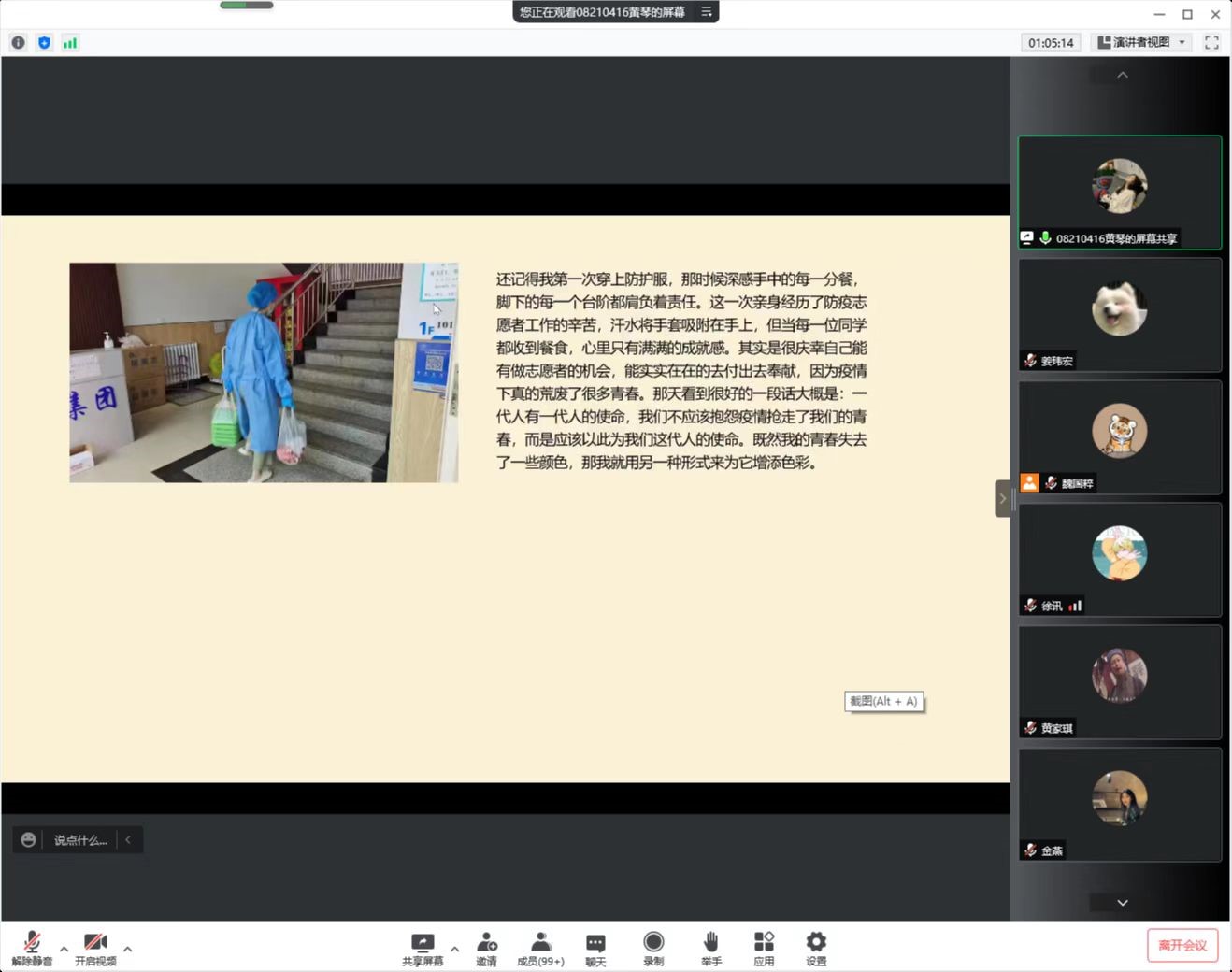 活动围绕 “讲述身边抗疫故事”进行了专题座谈,学院各本科生公寓学生志愿者负责人结合自身经历、抗疫实践、收获感受分享了心得体会。南苑1公寓志愿者负责人、2018级本科生谷瑛淏以“青春政好,疫不容辞”为主题,分享了疫情期间感受到的同学们的友爱与善良、责任与担当、团结与务实;2018级本科生金燕作为南苑9公寓年级志愿者负责人之一,结合个人经历进行了分享,体现了青年学子用志愿精神来诠释当代青年的初心与使命,万众一心、抗击疫情;南苑9公寓年级志愿者负责人、2019级本科生吴晗带领大家回顾了为期50余天的志愿服务,志愿者们无私奉献,出色地完成了各项服务工作。2020级本科生姜玮宏、李珍两位同学共同分享了南苑2公寓的抗疫故事,从日常“三餐一水”的配送,到与其他学院同学的沟通协调,后期的点位志愿者安排等,彰显了同学们众志成城、共克时艰的精神风貌。文苑2公寓志愿者负责人、2021级本科生刘祉含结合几位志愿者的典型事迹,分享了志愿者们在公寓中服务、奉献的感人瞬间;文苑3公寓志愿者负责人、2021级本科生黄琴以“文三中的我们”为题,分享了抗击疫情过程中对于ManHub