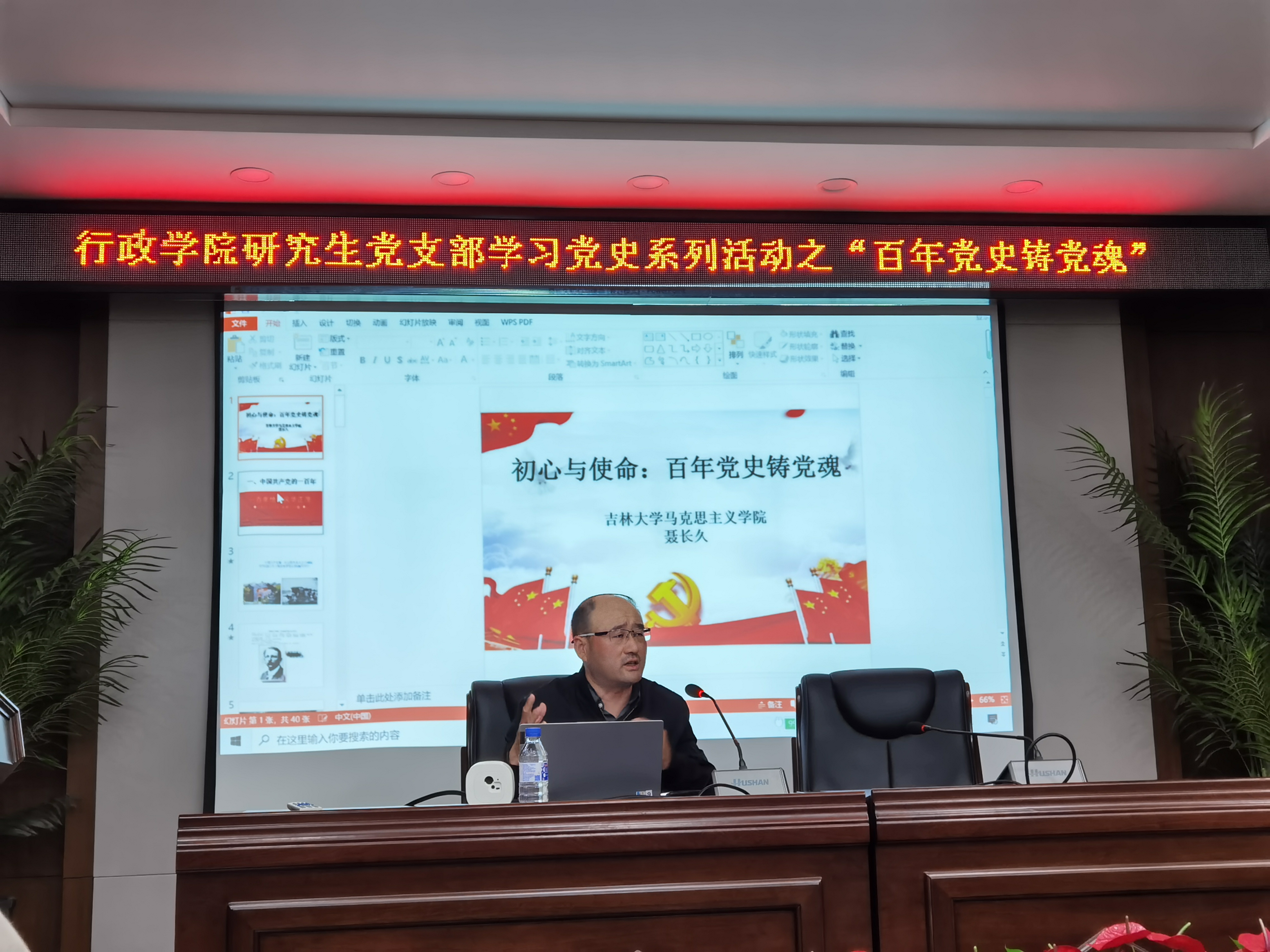 聂老师长期从事马克思主义理论的相关研究,他以时间为轴线,从党的历任领导人的更替中阐释其对党史的独到见解,给同学们带来了耳目一新的党史学习体验。首先,聂老师对建党百年来的历史阶段进行了划分,他认为对于党史起点的研究可以前溯至五四运动时期,受到了思想启蒙运动的影响。聂老师简要概括了每一个历史阶段中的标志性事件,并对其进行了生动的解读。其次,聂老师以党的历任总书记的更替为时间线索,详细讲解了不同时期我们党的工作重心、面临的困难以及解决问题的根本遵循与具体路径。他将党史与我校校史相结合,讲述了不同阶段杰出历史人物的影响与作用。最后,聂老师认为共产主义理想是一百年来真正推动中国共产党人不断向前发展的动力之源,他以马克思主义基本原理的方法论为分析工具,凭借他扎实的理论基础,深入浅出地阐释了中国共产党的先进性所在。