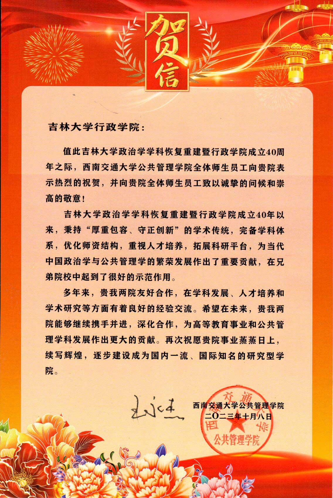 西南交通大学公共管理学院的贺信-吉林大学行政学院 <#webadvjs#>